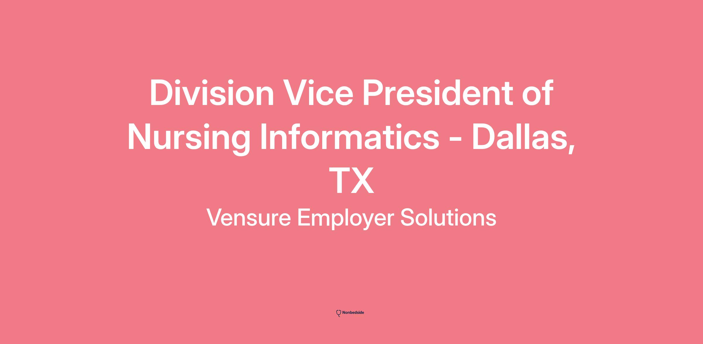 Division Vice President of Nursing Informatics - Dallas, TX Join to apply for the Division Vice President of Nursing Informatics - Dallas, TX role at Vensure Employer Solutions