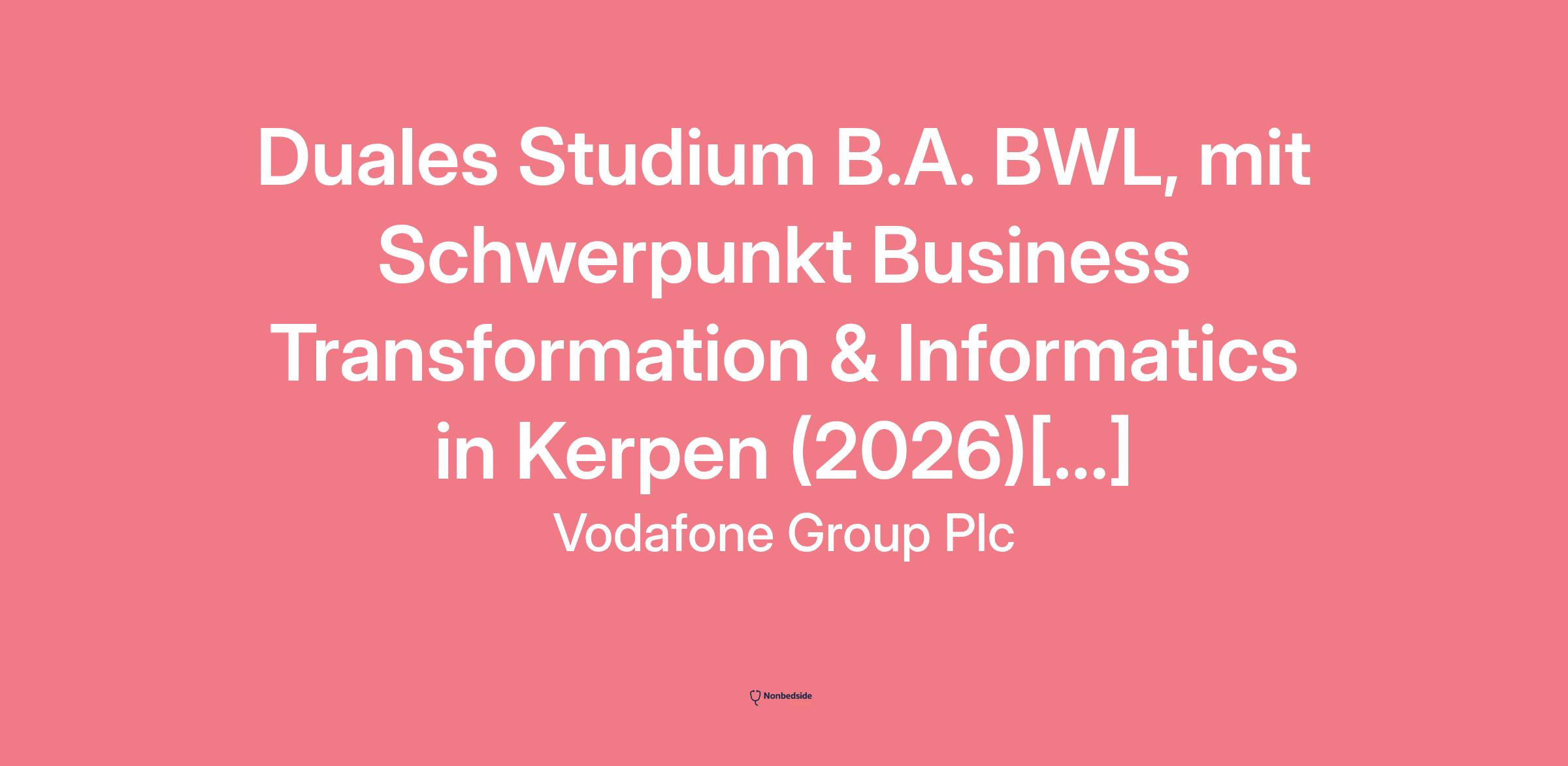 ## Duales Studium B.A. BWL, mit Schwerpunkt Business Transformation & Informatics in Kerpen (2026)KERPEN, GermanyBei Vodafone arbeiten wir jeden Tag an einer besseren Zukunft. Für eine Welt, die besser vernetzt, inklusiver und nachhaltiger ist. Denn für uns ist Technologie nur so stark wie die Menschen, die sie nutzen. Sei dabei und lass uns gemeinsam die Welt von morgen gestalten.**Was Dich erwartet:*** Die Praxisphasen verbringst Du bei uns in Deiner lokalen Niederlassung, dem Homeoffice oder auch 20 Tage im Jahr im EU-Ausland Deiner Wahl!* Zusammen mit Deiner Mentorin oder Deinem Mentor entscheidest Du, welche Bereiche Du bei uns kennenlernen möchtest und welche Aufgaben Du übernimmst. Zum Beispiel: + Vermittlung zwischen kaufmännischen und technischen Bereichen "Prozessoptimierung/Automatisierung" + Projektmanagement + Analyse von Innovationen und Trends im eCommerce + Einbringen und Umsetzen innovativer digitaler Ideen + "Service und Erlebnis der Kund:innen für die Zukunft gestalten"* Dein Verantwortungsbereich wächst mit Deinem Studienfortschritt: Gestalte aktiv mit und übernimm die führende Rolle in Deinen eigenen Projekten!**Dein Karriere-Start bei Vodafone:** Duales Studium ->Übernahmegarantie-> Berufseinstieg (bspw. als Content Editor, Developer, Vertriebskanalmanager:in, Personalreferent:in) -> berufsbegleitender Master bei Interesse**Das hast Du Dir verdient:**1. Studienjahr: 1.242,00 € pro Monat 2. Studienjahr: 1.358,00 € pro Monat 3. Ab dem dritten Studienjahr: 1.468,00 € pro Monat**Du bekommst noch:**150€ monatlich als Studi-Zulage 90 € monatlich für Deine privaten Handy- und Internetverträge Zuschüsse zu Fahrtkosten, Lehrmitteln und Verpflegung Wir übernehmen Deine Studiengebühren**Deine weiteren Vorteile bei uns:*** Flexibles Arbeiten + Hybrid Working ermöglicht Dir die Arbeit im Büro und aus dem Homeoffice. Zusätzlich kannst Du bis zu 20 Tage pro Jahr im EU-Ausland sowie in immer mehr Nicht-EU-Ländern arbeiten.* Laptop & Homeoffice-Ausstattung + Du bekommst von uns Dienst-Handy und -Laptop und eine komplette Ausstattung für Dein Homeoffice mit Internet, Schreibtischstuhl, Bildschirm, Kopfhörern und so weiter.* Auslandsaufenthalt + Zusätzlich zu unserem Full Flex Office hast Du die Möglichkeit Dich an einem Projekt in einem unserer Auslandsstandorte zu beteiligen.* Vodafone Spirit + Sneaker statt Lederschuhe. Zusammenarbeiten auf Augenhöhe statt Hierarchie-Denken. Das ist unser Spirit – neugierig, leidenschaftlich und vertrauensvoll.**Duales Studium B.A. BWL, mit Schwerpunkt Business Transformation & Informatics in Kerpen (2026)** **Partner-Hochschule:**ADG Business School in Dortmund und virtuell **Studiengang:**Business Administration mit Spezialisierung Business Transformation & Informatics **Start:** 01.05.2026 oder 01.11.2026 **Dauer:**3,5 Jahre **Studienmodell:**4 Tage Arbeit bei Vodafone und 1 Lerntag pro Woche im Selbststudium + 2x 4 Tage pro Semester an der ADG **Abschluss:**Bachelor of Arts (B.A.) mit 180 ECTS-Punkten