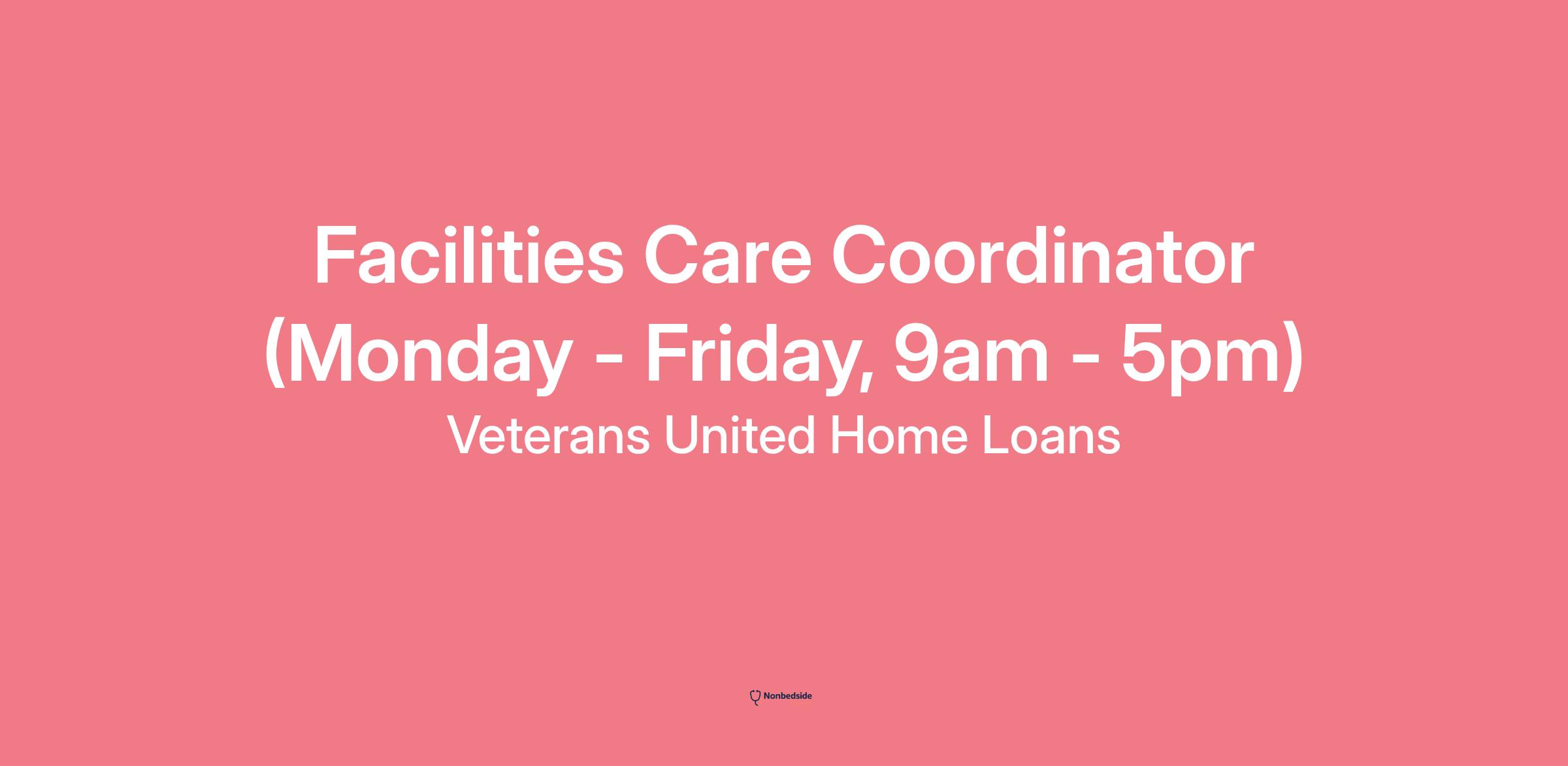 Facilities Care Coordinator (Monday - Friday, 9am - 5pm) page is loaded## Facilities Care Coordinator (Monday - Friday, 9am - 5pm)locations: Columbia, MOtime type: Full timeposted on: Posted Todayjob requisition id: R5514Whether you come from a background in maintenance, hospitality, facilities management, or customer service, you can be successful in this role. We don’t require a specific degree or experience, but we’re looking for translatable skills and relevant expertise. We will provide you with the training and development opportunities needed to build a career here!**We’re looking for rock stars for the 9am - 5pm shift in Columbia, Missouri!*****This is an hourly position that includes quarterly bonus compensation for performance that offer potential earnings of $38,500 - $45,000 per year. Our performance incentives are designed to reward your hard work and dedication.*****\*\*We are also excited to offer a $500 sign-on bonus\*\*****About The Role:**As a Facilities Care Coordinator, you are responsible for keeping our office buildings sparkling clean as a way to enhance the lives of fellow employees. From maintaining tidy workspaces to creating a welcoming environment in common areas, your work helps create a space where our team can thrive. You’ll play an important part in fostering a clean, safe, and comfortable environment that reflects the care we have for one another.Here’s a snapshot of what you’d be doing:* Cleaning and maintaining restrooms, kitchens, conference rooms, and other common spaces to make sure everything is organized and welcoming.* Removing trash and recycling, dusting, mopping, and vacuuming to keep our spaces clean and comfortable.* Monitoring and stocking supplies so we’re always ready for the next busy day.* Deep cleaning appliances, equipment, and vending machines inside and out.* Clearing sidewalks, visitor parking spaces, handicapped spots, and expectant mothers' spaces of ice, snow, and debris during inclement weather to keep everyone safe and happy.* Pitching in wherever needed (excluding licensed tasks) and help foster a supportive and collaborative team culture.**About You:*** You’ve got a knack for managing your time and staying on top of tasks, keeping everything running smoothly.* Exceptional customer service skills come naturally to you, always making others feel valued.* You thrive in a highly cooperative work setting, where teamwork and collaboration drive success.* Adaptable to change, you can easily shift priorities to meet new challenges.* You excel in fast-paced, results-oriented environments, always staying focused on getting things done.* Previous custodial experience is a plus, but you're otherwise eager to learn and grow in the role.* You’re able to lift at least 50 lbs and stay active on the job, keeping everything in motion.* Regular and predictable attendance is important to you, always showing up ready to contribute.We’re all about helping Veterans and military families become homeowners. In two short decades, we closed over 500,000 VA Loans and became the #1 VA lender for homebuyers in the nation. But to us, success isn’t measured in numbers. Our success is measured in living our every day: Be Passionate and Have Fun, Deliver Results with Integrity and Enhance Lives Every Day. We always strive to provide friendly service to military homebuyers and their families. And we always seek to lift up people and communities across the country.We’re so glad you’re here checking out this opportunity! If this role gets you excited but you’re worried you don’t check every box – don't sweat it. We’re more interested in what you can bring to the team than a perfect checklist. If you’re passionate, driven, and ready to make a difference, we’d love to hear from you. Come as you are, and together we’ll create something amazing.Learn more about Veterans United on and our career site atVeterans United Home Loans and its affiliates are Equal Opportunity Employers that consider all qualified applicants regardless of race, color, religion, sex (including pregnancy, transgender status, and sexual orientation), national origin, age (40 or older), disability or genetic information.