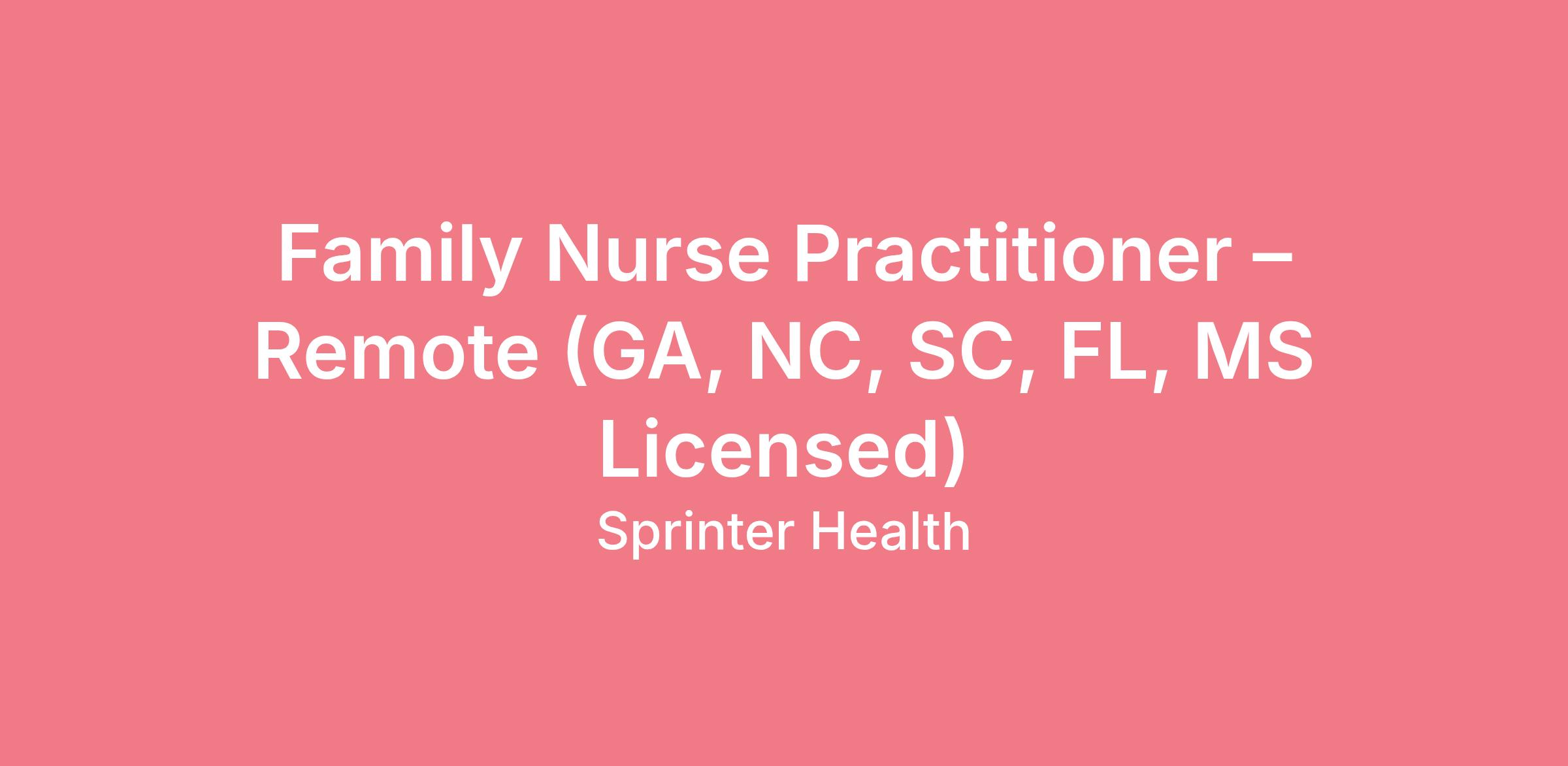 Family Nurse Practitioner – Remote (GA, NC, SC, FL, MS Licensed)