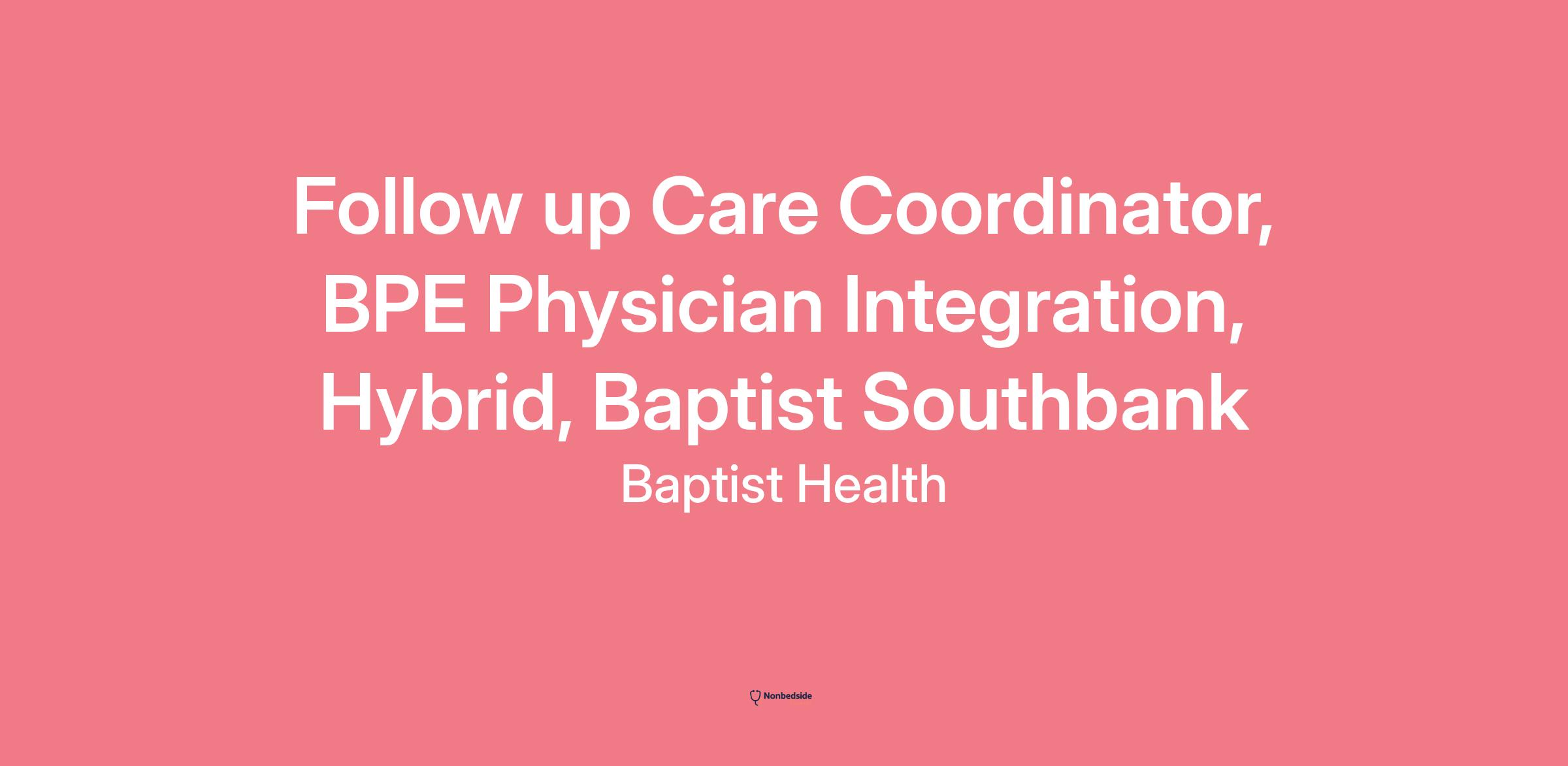 Follow up Care Coordinator, BPE Physician Integration, Hybrid, Baptist Southbank Baptist Health is hiring a Follow Up Care Coordinator to join the BPE Physician Integration team. This is a full-time, hybrid opportunity located at Southbank.