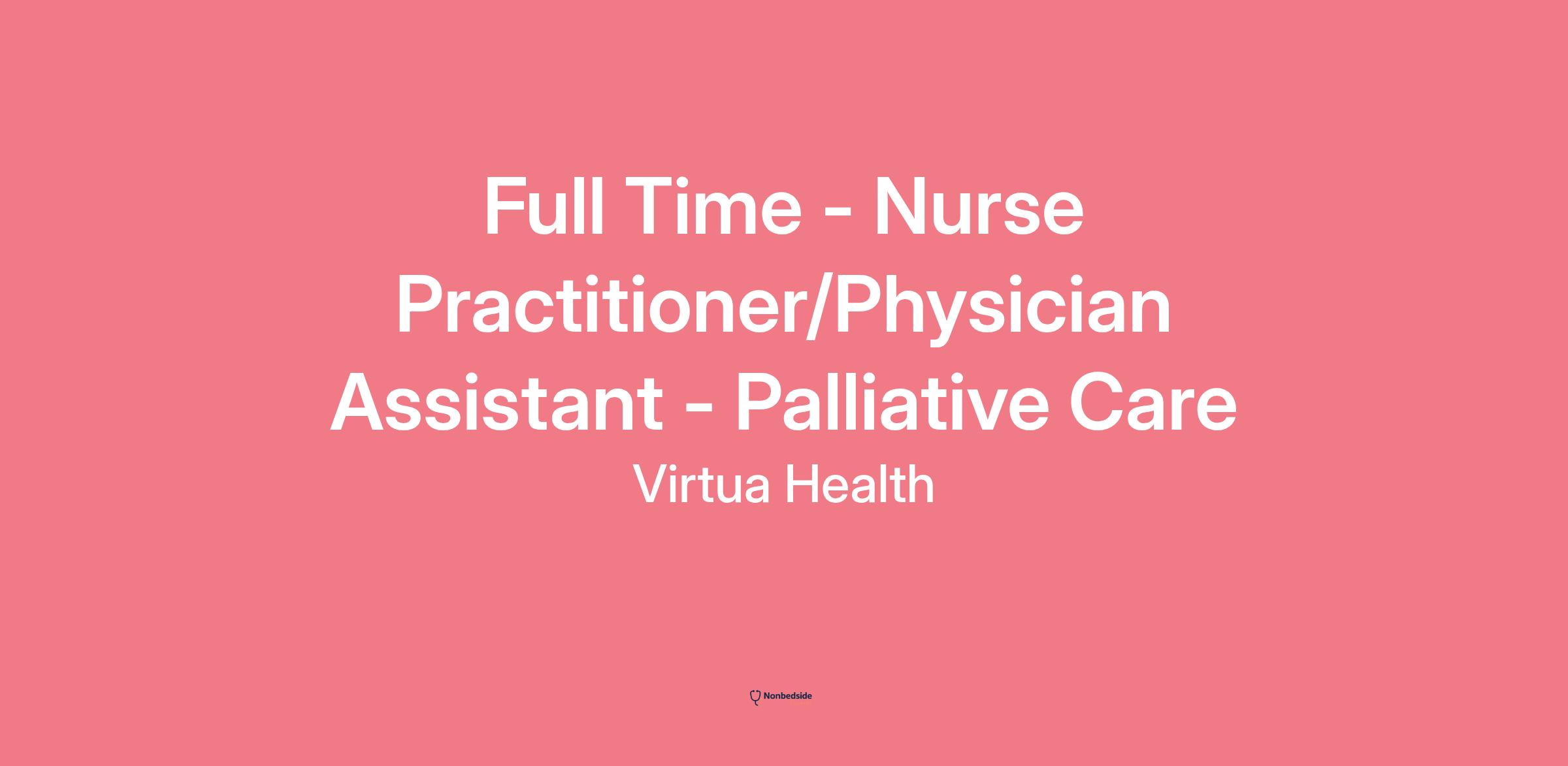 Full Time - Nurse Practitioner/Physician Assistant - Palliative Care At Virtua Health, we exist for one reason – to better serve you. That means being here for you in all the moments that matter, striving each day to connect you to the care you need. Whether that’s wellness and prevention, experienced specialists, life‑changing care, or something in-between – we are your partner in health devoted to building a healthier community.