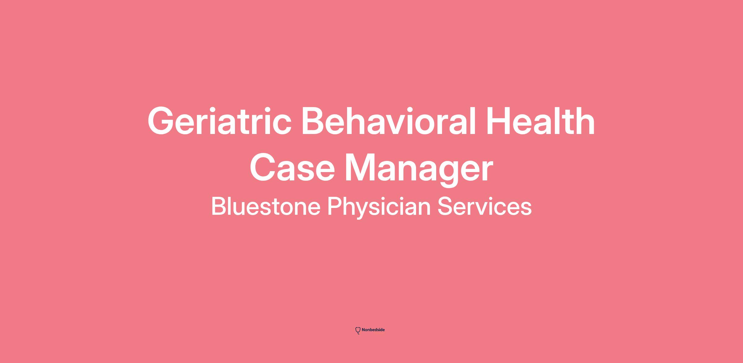 Position Geriatric Behavioral Health Case Manager is a core member of the collaborative care team, which includes Bluestone\'s Primary Care Providers, Nurses, Care Managers and other medical professionals. The Behavioral Health Care Manager is a patient-focused role, primarily working with a complex geriatric population and their families within their home environment (Assisted Living, Memory Care, and/or Independent Living). This role is an expert in dementia care, Alzheimer\'s, memory loss, and/or mental health targeting interventions that improve the patient\'s overall quality of life.