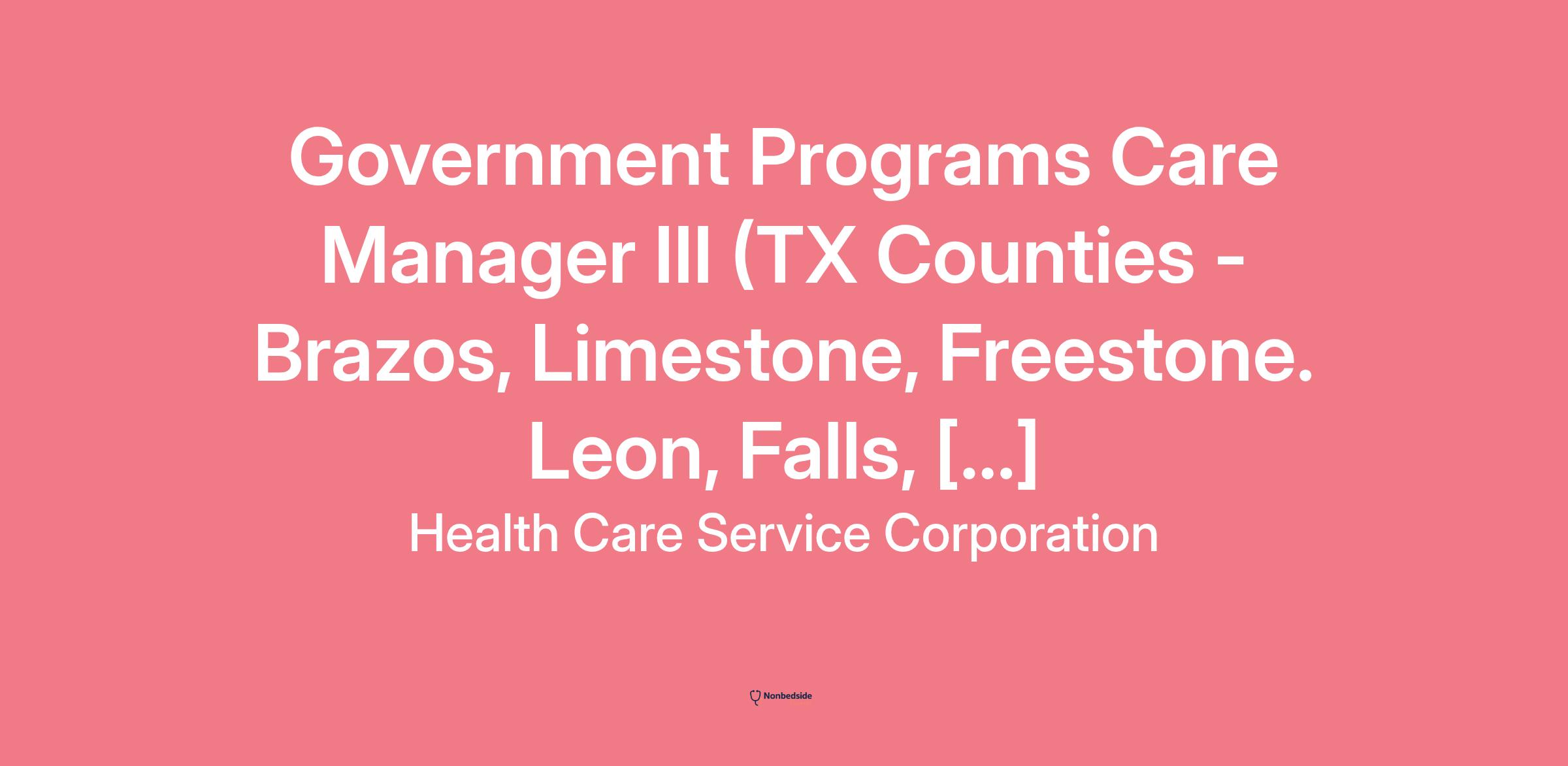 Join to apply for the Government Programs Care Manager III (TX Counties - Brazos, Limestone, Freestone. Leon, Falls, Robertson, Madison, Milam, Grimes, Burleson, Washington, Bell) role at Health Care Service Corporation