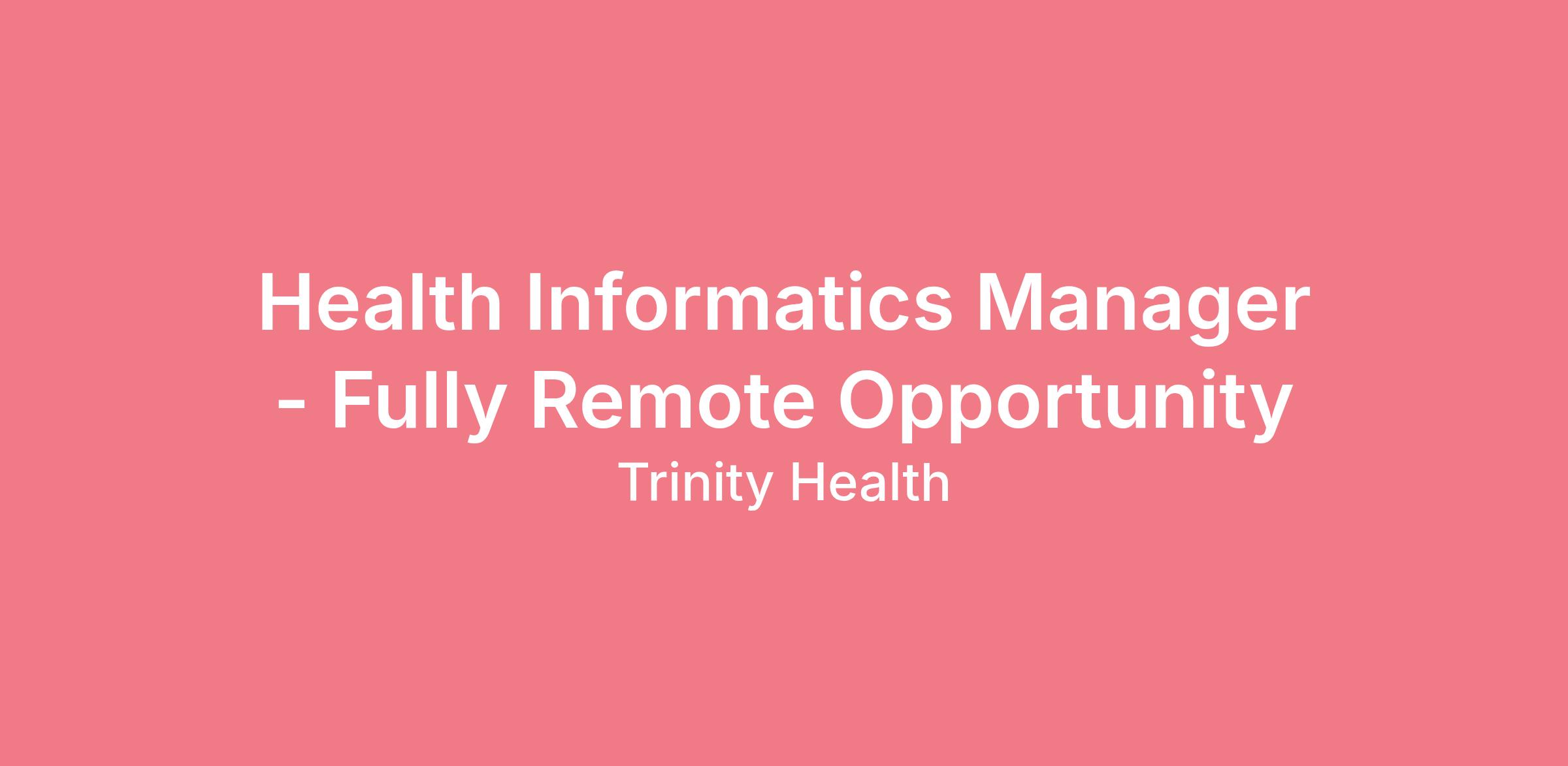 Applies management and health informatics principles for the coordination of all health informatics activities for a team, in support of quality in patient care, health care transformation and establishment of best practices. As a converging point person for people, process, and technology, the Manager, Health Informatics has a leadership role in transforming clinical care, maximizing the benefits of health information technology within TH. Serves as a key contributor working in collaboration with health care professionals on enterprise-wide health informatics projects and ensuring team participation and engagement is appropriately aligned. Collaborates with Health Informatics, Clinical and Operational leadership to guide and coordinate the standardization and adoption of evidenced-based processes and content across the care continuum. Leverages health information technology, including clinical decision support, as well as process improvement tools, project management and communication skills to enable achievement of clinical and operational priorities. Coordinates health informatics initiatives and leads multidisciplinary teams to ensure optimal outcomes and adoption of new processes and content across the care continuum for the enterprise. Communicates findings and provides recommendations to Health Informatics leadership ensuring effective, efficient consistent delivery for health care transformation for the enterprise and in support of Health Informatics operational priorities.