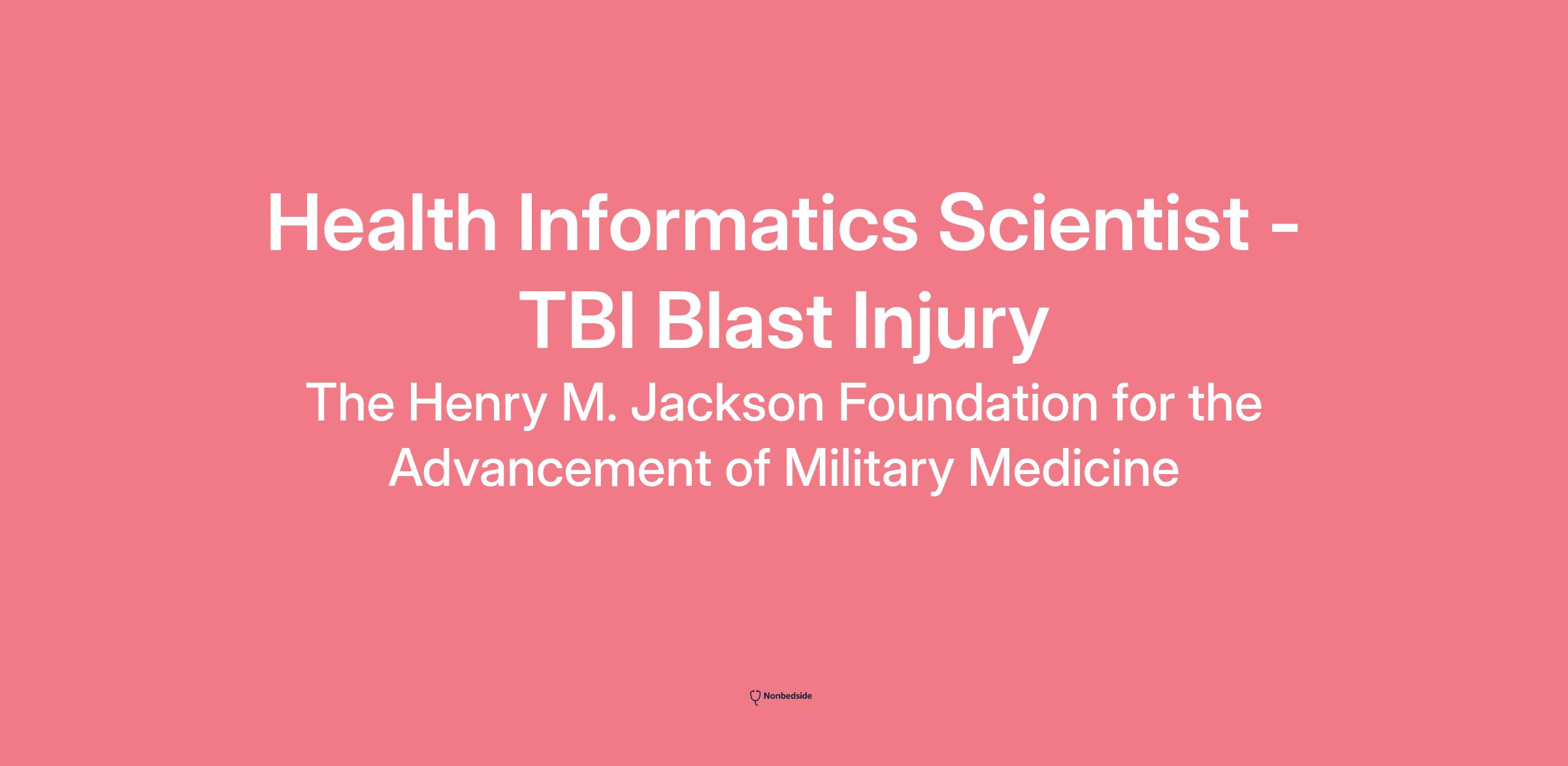 Overview Health Informatics Scientist - TBI Blast Injury role at The Henry M. Jackson Foundation for the Advancement of Military Medicine (HJF). The incumbent will join the Office of the Chief Medical Officer (CMO) for the Defense Intrepid Network, reporting directly to the principal CMO. The National Intrepid Center of Excellence (NICoE) is a DoD institute focused on evaluation, treatment, and research for service members dealing with mild traumatic brain injury (mTBI) and psychological health conditions. The NICoE maintains a large-scale informatics database with longitudinal data for hundreds of thousands of patients diagnosed with mTBI. HJF supports military medical researchers and clinicians in achieving their research goals.