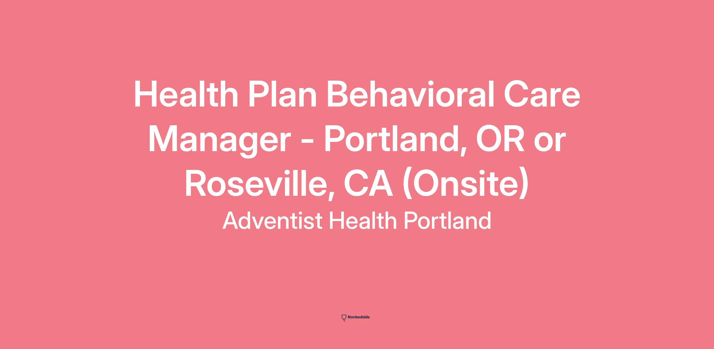 Health Plan Behavioral Care Manager - Portland, OR or Roseville, CA (Onsite) Join to apply for the Health Plan Behavioral Care Manager - Portland, OR or Roseville, CA (Onsite) role at Adventist Health Portland