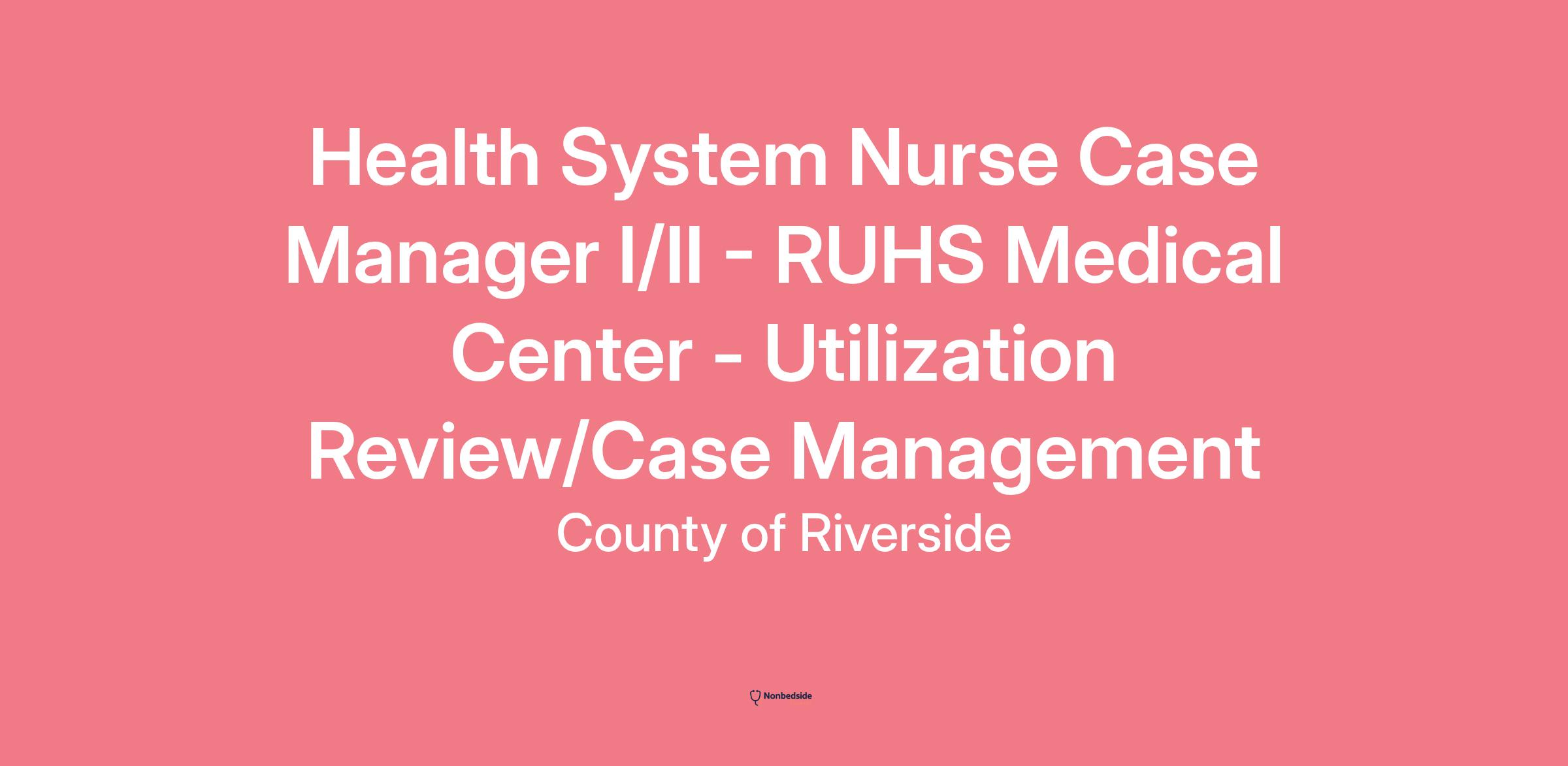 Health System Nurse Case Manager I/II - RUHS Medical Center - Utilization Review/Case Management The County of Riverside - Riverside University Health System-Medical Center is seeking highly skilled and experienced Registered Nurses to join our team as a Health System Nurse Case Manager with the Utilization Review (UR) Case Management Department.