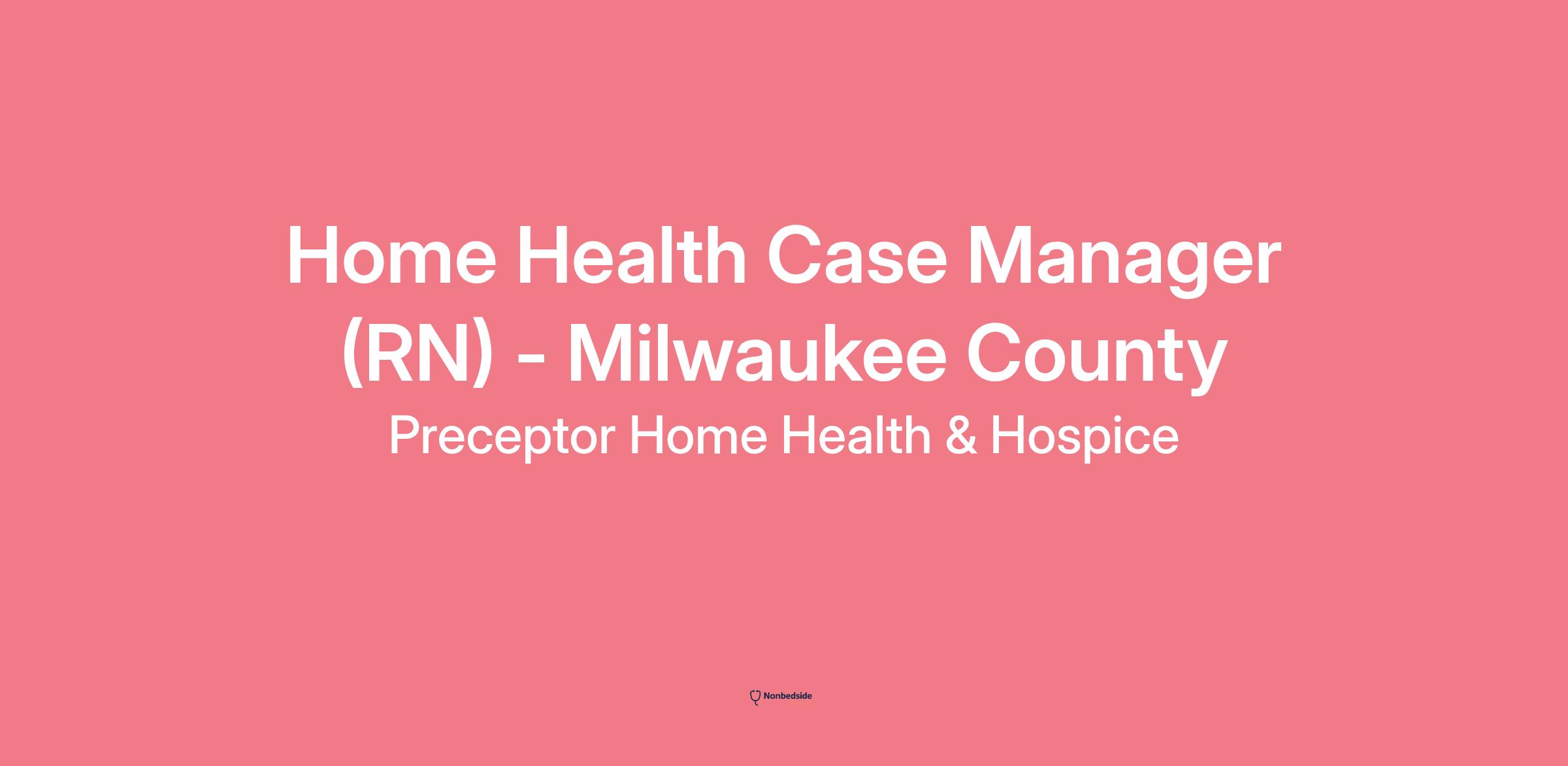 Overview SIGN-ON BONUS OFFERED!!!! We are seeking a Home Health RN Case Manager to provide care in Milwaukee County. At Preceptor Home Health and Hospice, we embrace an atmosphere of caring, belonging, and trust. You will enjoy meaningful connections with your patients and their families, with each other, and with the communities we serve. Preceptor strives to provide high quality care through our multifaceted programs. It is truly all about helping people and allowing you to build a meaningful career with us.