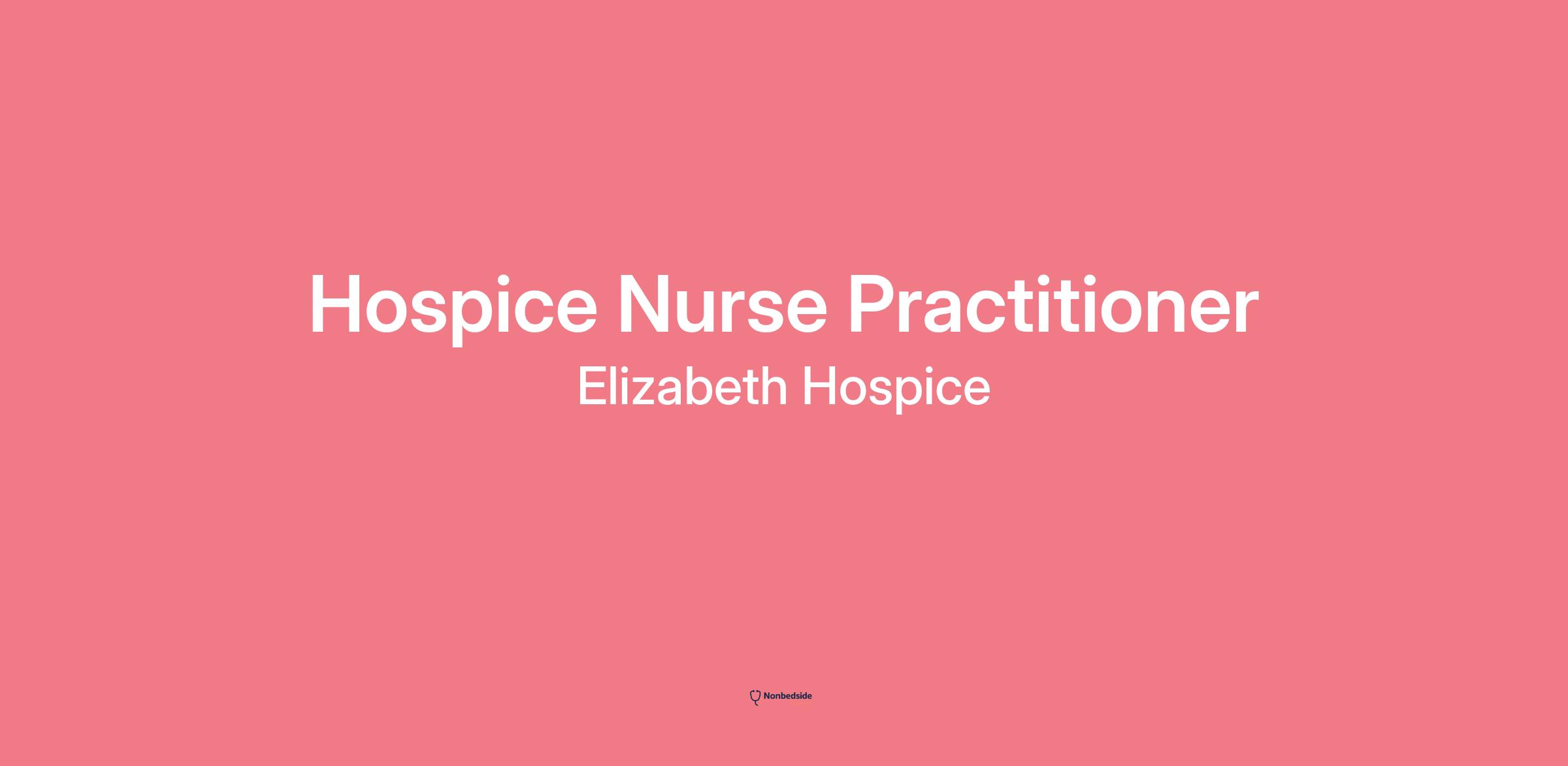 Overview The Elizabeth Hospice Nurse Practitioner provides quality hospice and palliative care to assigned patients across the life span (perinatal, pediatrics, and adults) while consulting with the team physician, associate medical director and chief medical officer (CMO). Consults, assesses, and evaluates the plan of care while collaborating with the IDT (interdisciplinary team), patient, family, and community physicians. Responsible for carrying out the mission, vision, values, and commitment to quality of The Elizabeth Hospice.