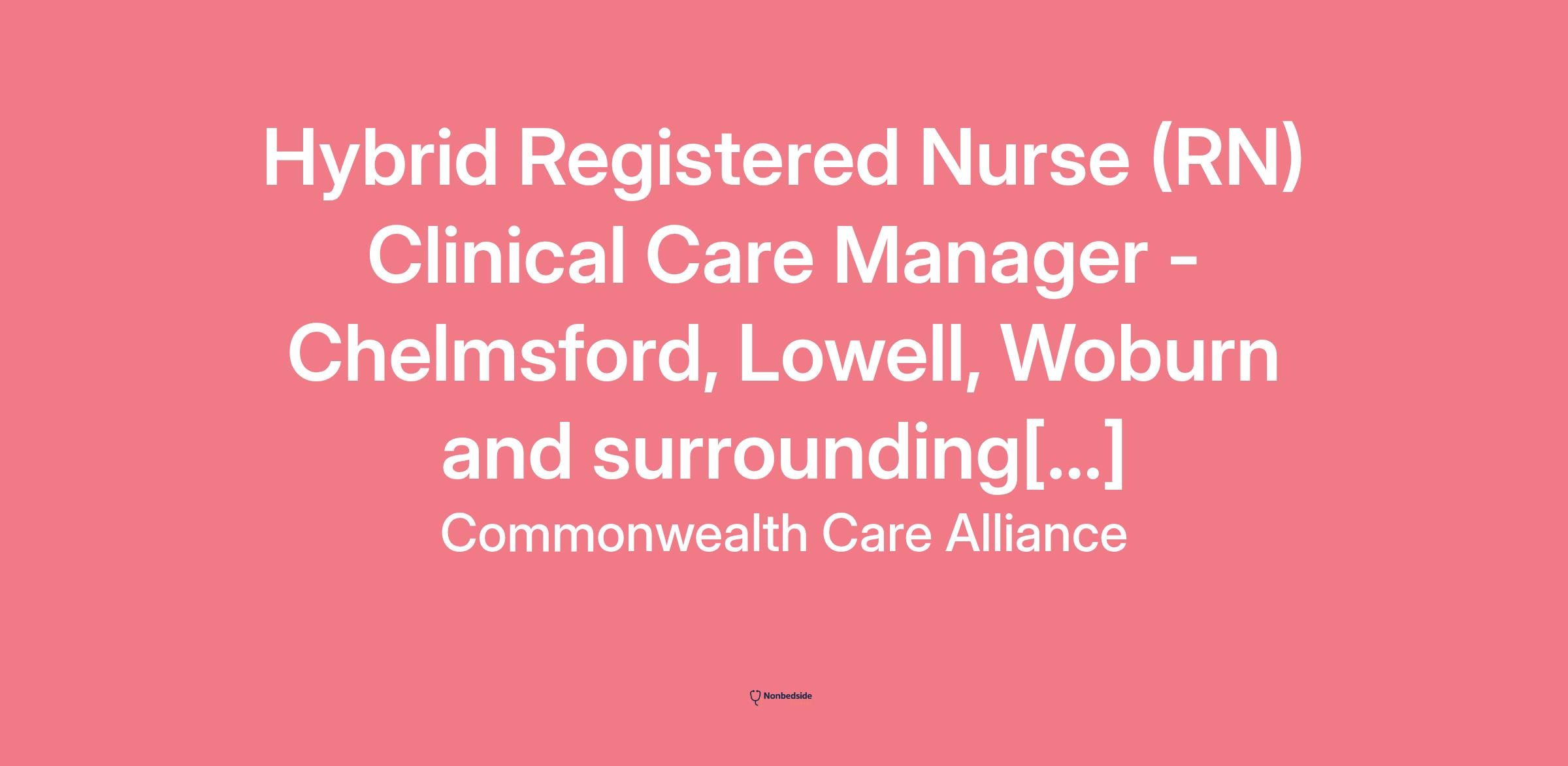 Hybrid Registered Nurse (RN) Clinical Care Manager - Chelmsford, Lowell, Woburn and surrounding areas Join to apply for the Hybrid Registered Nurse (RN) Clinical Care Manager - Chelmsford, Lowell, Woburn and surrounding areas role at Commonwealth Care Alliance
