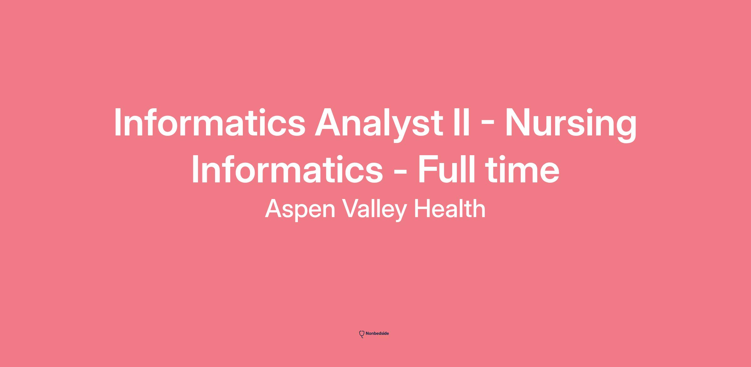 Overview We are currently hiring for a full time Informatics Analyst II within the Nursing Informatics department here at Aspen Valley Health.
