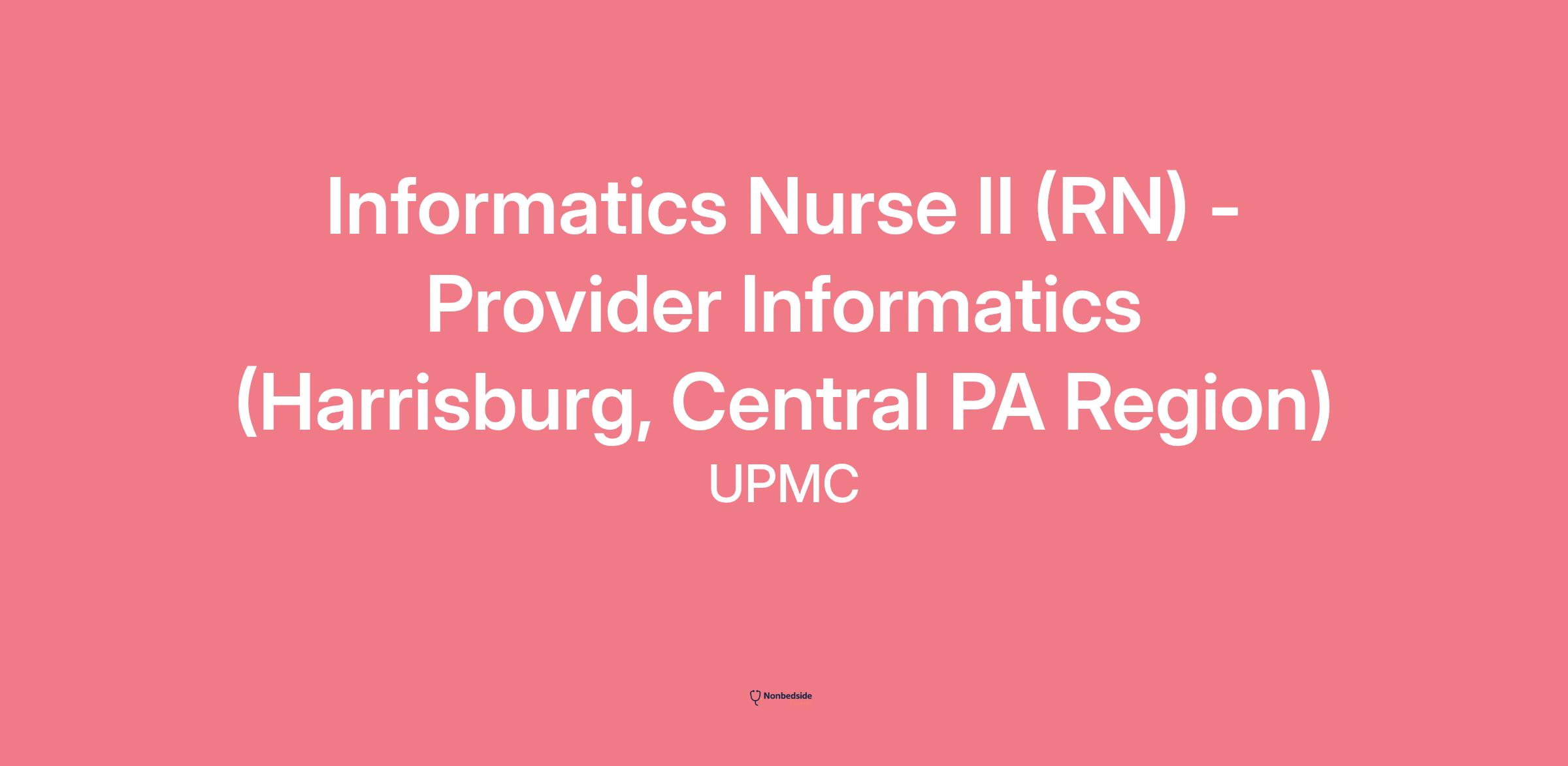 Informatics Nurse II (RN) - Provider Informatics - (Harrisburg, Central PA Region) Position Detail: * Full-time Regular, 40 hours per week, Salaried Position * Travel expected, primarily within Central PA region * Work Schedule: * Monday - Friday, primarily dayshift hours, 8:00am - 4:30pm * Occasional need for flexibility during early mornings and evenings * No weekends or holidays * Preferred Experience: * Epic experience * Epic training experience * Direct collaboration with physicians/APPs * Flexible Schedule * Strong and supportive culture of teamwork * Primarily work from home with hybrid travel expectations as needed Purpose: Under the direction of the Director, Clinical and Operational Informatics (DCOI), the Informatics Nurse II has the responsibility and accountability of leading the investigation, development, and implementation of new technology as it relates to clinical practice and serving as a liaison between the clinical and the technical personnel. Informatics nurse II works with project team members to ensure a successful, on time go live. He/she demonstrates knowledge of project management, methodology, organizational skills: possess strong group facilitation skills, provides direction and support for decision making; enables timely and effective communication among project team. Responsibilities: * Develops and conducts training programs for all levels of end users for new applications and upgrades. Evaluates tools for education programs, modifies scripting based on the changes in the application, including train domain build. Coordinates class schedules. Performs work in a timely manner, meeting assigned deadlines. Assigns deadlines for projects and assesses productivity and progress of informatics projects. Develops policy statements as they relate to informatics changes effecting nursing policies. Recommends additions to policies as needed for changes in eRecord. Monitors eRecord use by end users and adherence to policies ensuring quality and safety. Takes action to improved knowledge, skills and performance based on feedback or on self-identified developmental needs and provides similar feedback to co-workers * Develops and maintains productive working relationships internally and externally by demonstrating accountability for actions, enthusiasm, motivation and commitment to patients and colleagues. Demonstrates an understanding of cultural differences and holds peers accountable for healthy relationships. Maintains a conscious balance between work and personal life. Models safe work hours, time management and healthy lifestyle. Communicates with peers and management any safety hazards identified in the workplace. * Is empowered to engage appropriate health care personnel and eRecord team members as issues arise. Identifies and communicates learning needs to appropriate manager. Prior to performing new or challenging skills, requests assistance and reviews relevant policies and procedures. Coordinates and participates interdepartmental and system activities to enhance communication and social interaction. Develops, organizes and assigns educational training programs to assure proficiency of the informatics team. Provides mentorship at any level. Including the system level, to enhance the education and growth of future informatics nurses. * Supervises creation of educational materials and also actively assists in creating educational materials in accordance with system standards for educational documents. Assess what communication tools will be effective for the end users that are being trained and assess effectiveness of education in coordination with the DCOI. Assigns appropriate staff for completion of the communication/education plan. Demonstrates advance knowledge of system integration and applications. Provides education to Informatics nurses/councils on technology applications and their impact to the end users. Advanced knowledge is used to problem solve and work with system teams to advance and prevent system compromise. * Enhances the partnership with nursing units and end users to maintain open dialogue with all levels of informatics. Responds to issues and creates an open workflow to support change to the eRecord. Supports the Informatics nurse I in developing relationships with end users and development of project plans for end users ideas. Maintains membership and provides collaboration and or leadership to committees, work groups, or task forces as needed to communicate and facilitate the ongoing progress of development, implementation, and revision of the clinical information system. Significantly contributes in Informatics Professional organizations activities to enhance personal growth and cultivate relationships in the field at a regional and national level. Performs all other job-related activities as assigned. Collaborates with key personnel as appropriate to investigate new technology to finalize and advance the project goals. * Participates or chairs informatics councils at both system and local levels. Able to prepare meeting agendas, handouts and documentation of meeting minutes. Demonstrates skills of professional presentation of topics via public speaking or the written word. Supports Informatics I nurse in developing skills for presentation at local and system meetings. Collects and coordinates the flow of data to support system and local projects. Correlates and trends data to analysis the effectiveness or progress of projects to hospital departments, as directed by DCOI. Provides education of available reports to hospital management. * Provides assignments for continuous improvement projects for the maintenance of the eRecord. Assists the DCOI in formulating system and local plans for improvement strategies for quality and regulatory initiatives. Assesses projects for submission and participates in research activities, develops plans for future research topics, submit abstracts for presentations at local, regional and national conferenc