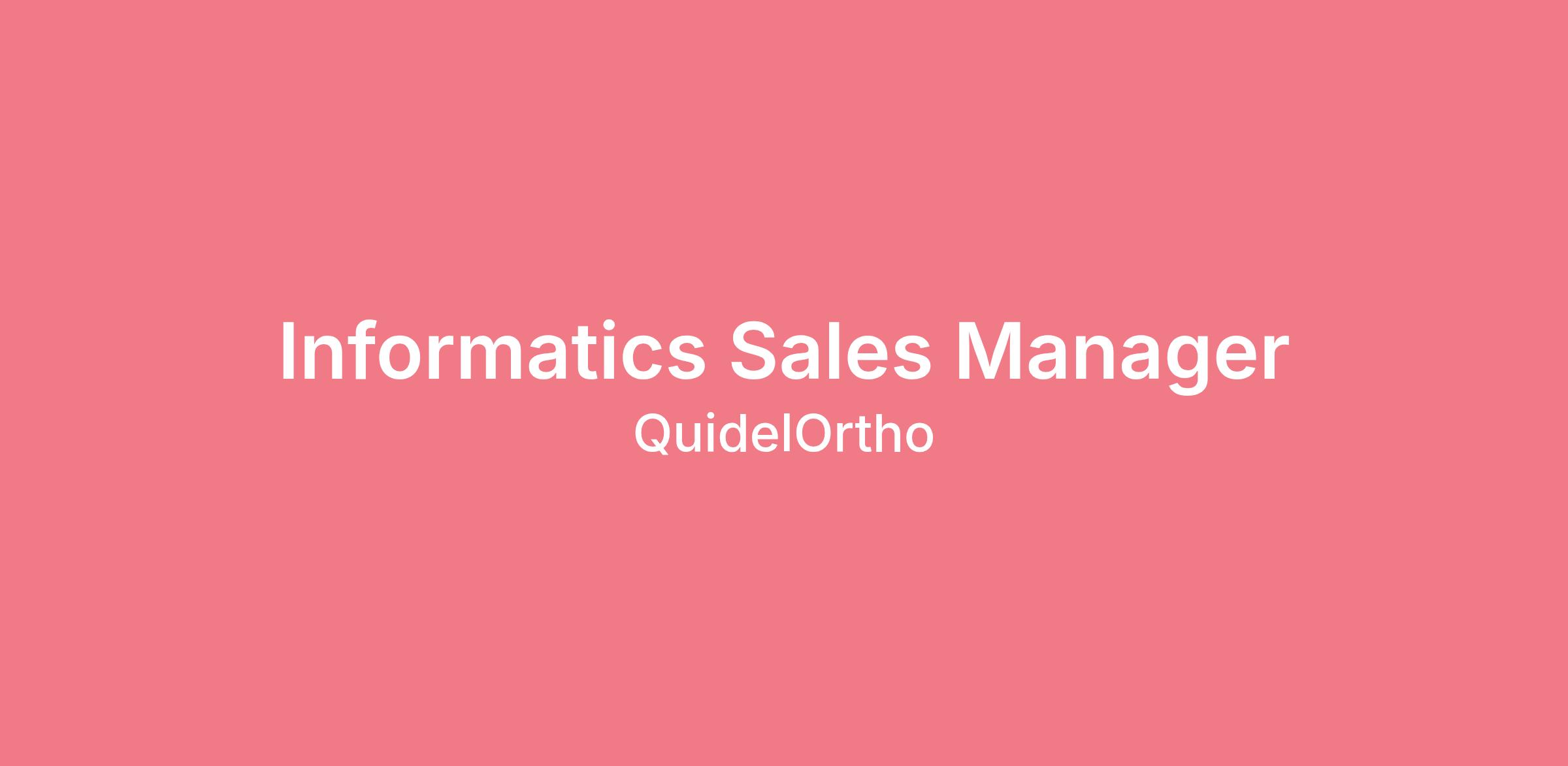 At QuidelOrtho, we’re advancing the power of diagnostics for a healthier future for all. Join our mission as our next Informatics Sales Manager. The Informatics Sales Manager will be responsible for overseeing QuidelOrtho Results Manager informatics sales and managing current Data Innovations placements with Vitros Automation Solutions. Accountable for leading and executing the sales process, demonstrating product expertise, and selling to executive-level professionals. Leverages data from process flow, workload mapping, lab economics, progressive investment strategies to secure new informatics systems compatible with QuidelOrtho Automation Solutions and retain existing non-automated high priority accounts via informatics sales. Translates the company’s strategic imperatives into execution plans within assigned geography while informing the organization about market trends.