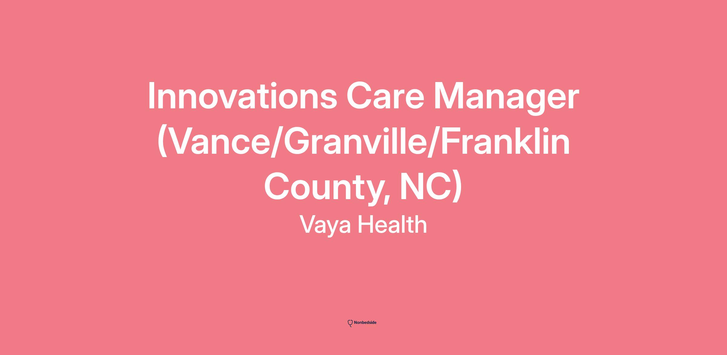 Innovations Care Manager (Innovations CM) is responsible for providing proactive intervention and coordination of care to eligible Vaya Health members and recipients ("members") to ensure that these individuals receive appropriate assessment and services. The Innovations CM works with the member and care team to alleviate inappropriate levels of care or care gaps through assessment, multidisciplinary team care planning, linkage and/or coordination of services needed by the member across the MH, SU, I/DD, TBI, physical health, pharmacy, LTSS and unmet health-related resource needs networks. Innovations CMs support and may provide transition planning assistance to state, and community hospitals and residential facilities and track individuals discharged from facility settings to ensure they follow up with aftercare services and receive needed assistance to prevent further hospitalization. This is a mobile position with work done in a variety of locations, including members\' home communities. The Innovations CM also works with other Vaya staff, members, relatives, caregivers/ natural supports, providers, and community stakeholders. As further described below, essential job functions of the Innovations CM include, but may not be limited to: