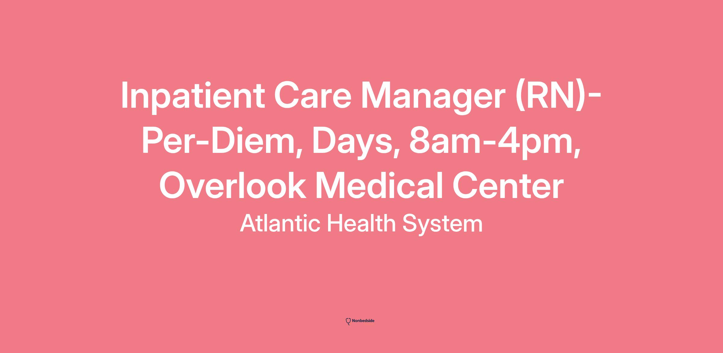 Inpatient Care Manager (RN)- Per-Diem, Days, 8am-4pm, Overlook Medical Center Join to apply for the Inpatient Care Manager (RN)- Per-Diem, Days, 8am-4pm, Overlook Medical Center role at Atlantic Health System