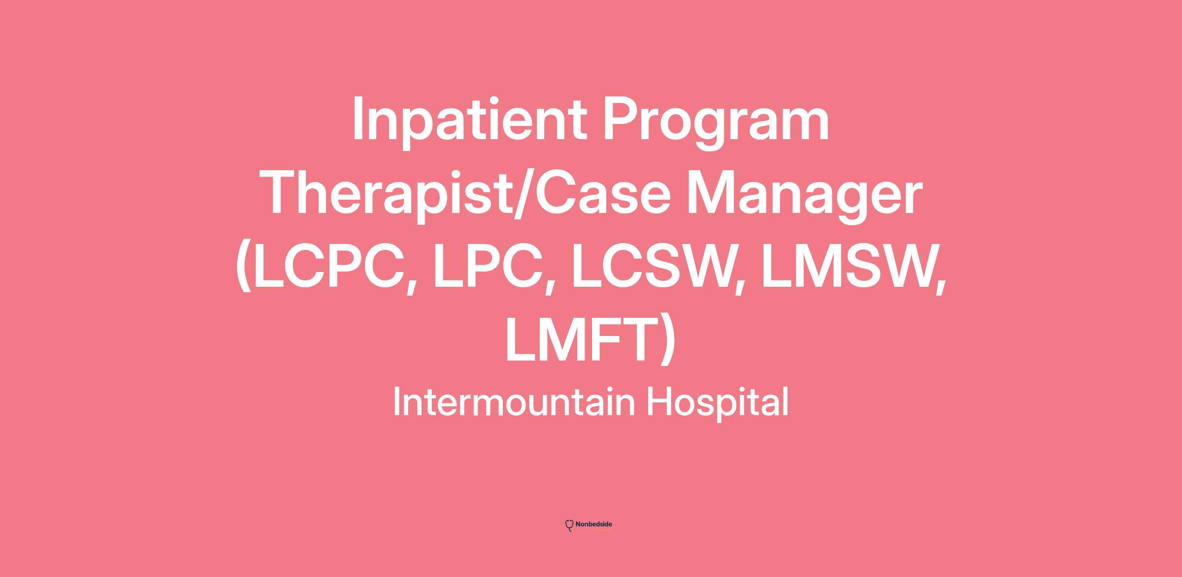 Inpatient Program Therapist/Case Manager (LCPC, LPC, LCSW, LMSW, LMFT) Join to apply for the Inpatient Program Therapist/Case Manager (LCPC, LPC, LCSW, LMSW, LMFT) role at Intermountain Hospital