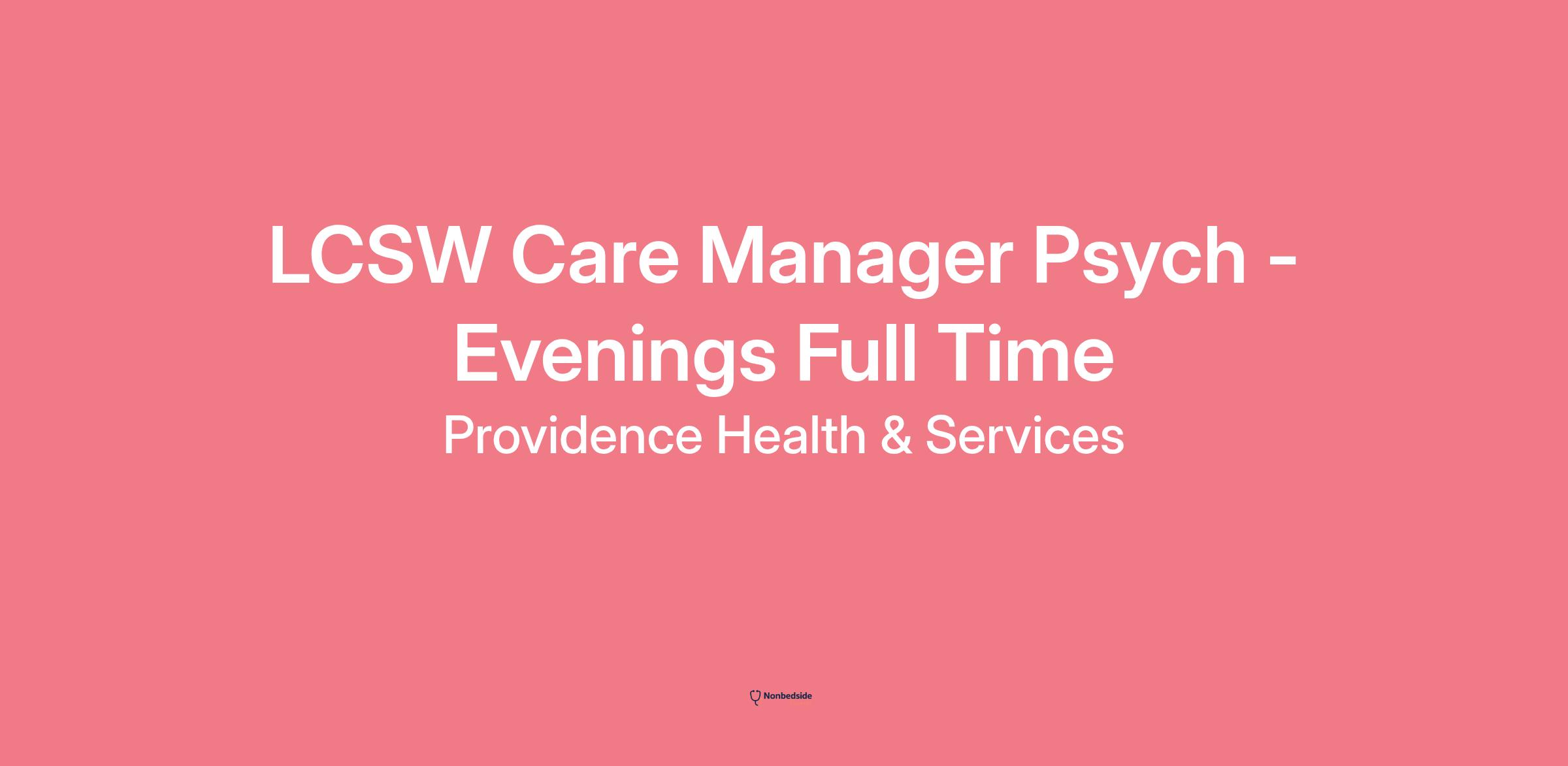 Overview LCSW Care Manager within our Psychiatric Department at Providence Little Company of Mary Medical Center in San Pedro, CA. This position is Full-Time and will work 8-hour Evening shifts (3pm - 11:30pm) to include weekend rotations.