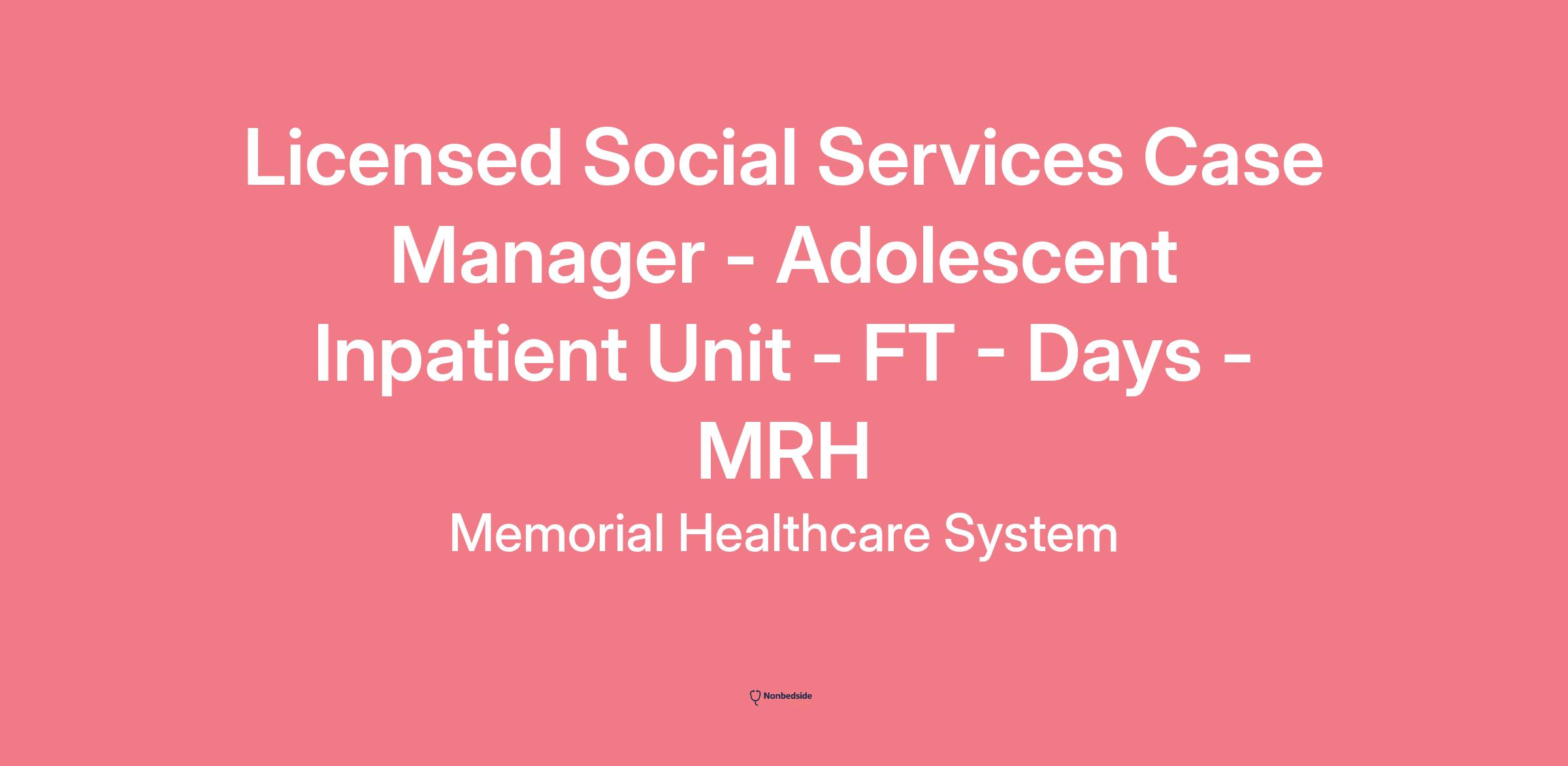 Licensed Social Services Case Manager - Adolescent Inpatient Unit - FT - Days - MRH Join to apply for the Licensed Social Services Case Manager - Adolescent Inpatient Unit - FT - Days - MRH role at Memorial Healthcare System