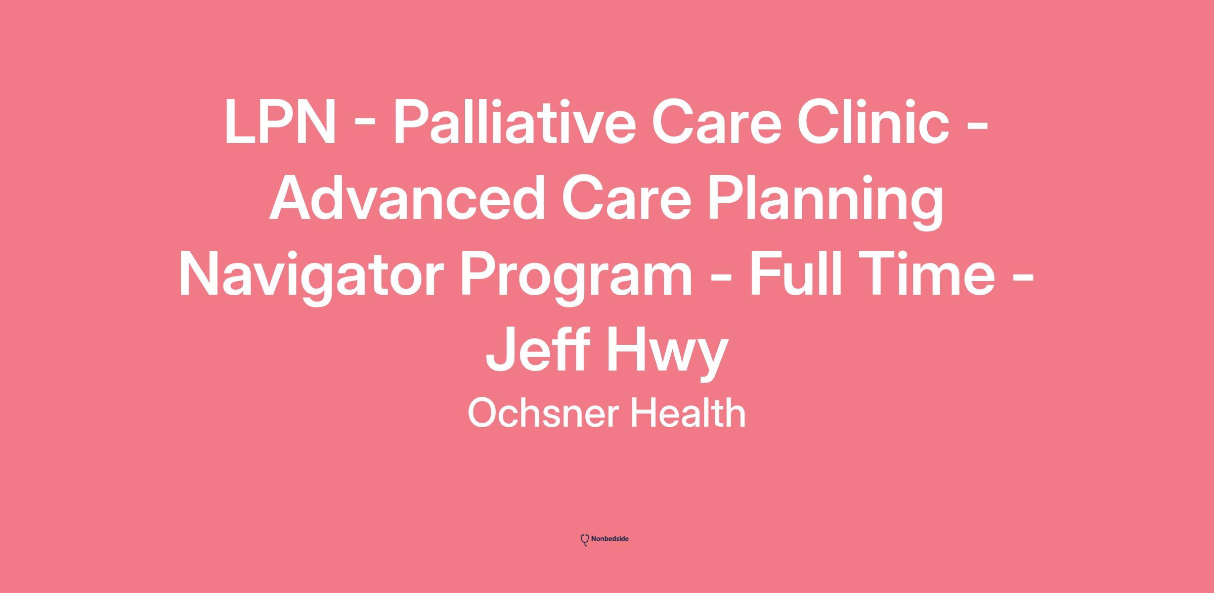 We've made a lot of progress since opening the doors in 1942, but one thing has never changed - our commitment to serve, heal, lead, educate, and innovate. We believe that every award earned, every record broken and every patient helped is because of the dedicated employees who fill our hallways. At Ochsner, whether you work with patients every day or support those who do, you are making a difference and that matters. Come make a difference at Ochsner Health and discover your future today! This job provides direct care (including IV therapy) of assigned patients within the framework of the Licensed Practical Nurse Act under the direction of a registered nurse. Directs and assists ancillary nursing staff with assigned duties and interacts with the multidisciplinary team and other personnel. Demonstrates professional responsibilities and is responsible for own practice and assists other members of the healthcare team in providing the highest quality personalized patient care.