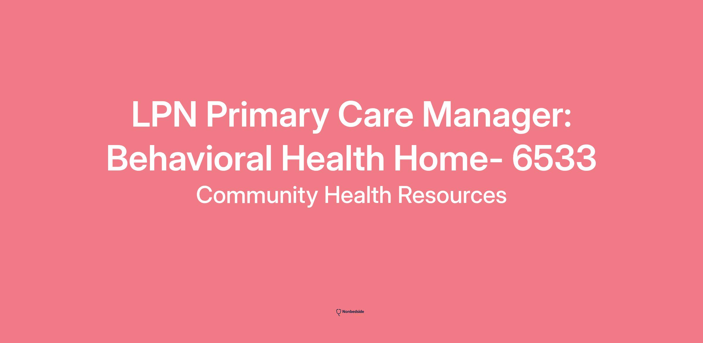 LPN Primary Care Manager: Behavioral Health Home- 6533 Join to apply for the LPN Primary Care Manager: Behavioral Health Home- 6533 role at Community Health Resources