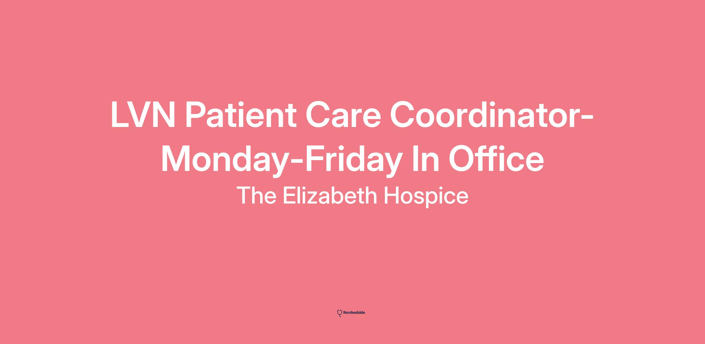 Overview The Elizabeth Hospice Patient Care Coordinator, LVN, is primarily responsible for patients clerical and communication care coordination from admission to discharge. Performs a wide variety of clerical and clinical duties for the Clinical Services Team assigned to including, but not limited to, processing and maintaining patients clinical records, Interdisciplinary Team (IDT) prep, processing and tracking physicians orders, processing patient authorization requests, certifications, and ensuring seamless communication between patients, staff, and team manager.