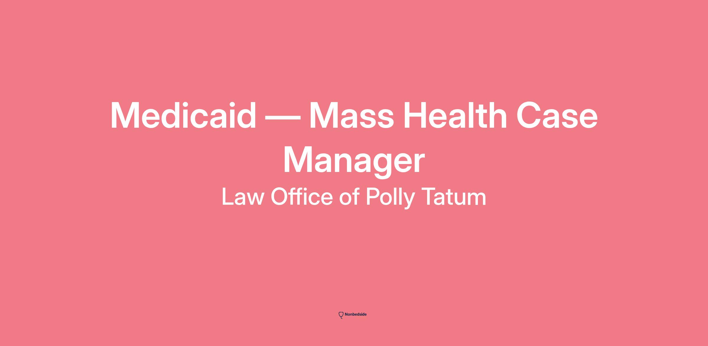 Overview The Law Office of Polly Tatum is seeking an experienced Medicaid /Mass Health Case Manager with expertise in Mass Health applications to join our dedicated team. As a Medicaid Case Manager — Mass Health Specialist, you will play a critical role in assisting clients in navigating the intricate Mass Health enrollment process, ensuring they gain access to essential healthcare coverage. Must have completed at least 25 Mass Health applications! The ideal candidate will have a comprehensive understanding of Mass Health regulations, possess excellent communication skills, and be committed to delivering the highest level of advocacy and support to clients.