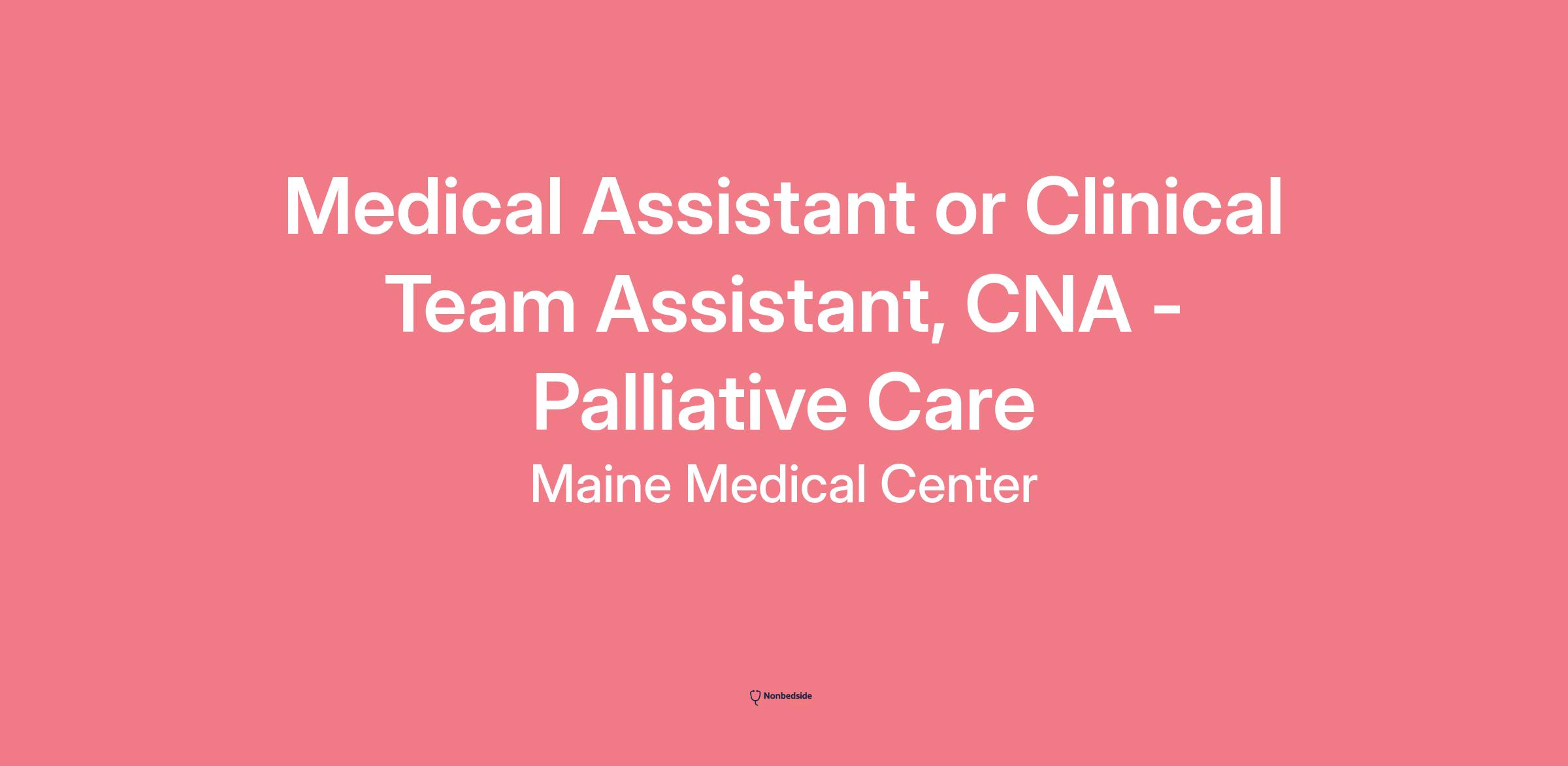 The Palliative Care Medical Assistant or Clinical Team Assistant plays a key role in our outpatient practice located in Scarborough, ME. The MA/CTA is part of an interdisciplinary team that cares for patients and supports families through complex illnesses. Palliative care focuses on quality of life and helps align the individual's medical care with their goals and priorities. The MA/CTA fosters a compassionate environment and is instrumental in the patient experience and operations of the clinic. This is a Monday - Friday schedule, but can be flexible: we would consider four 9-9.5 hour days/week or four 9's and a half day. We do our best to give the same day off a week (but not Fridays or Mondays every week). We are a great team and would welcome your application! Summary - Medical Assistant