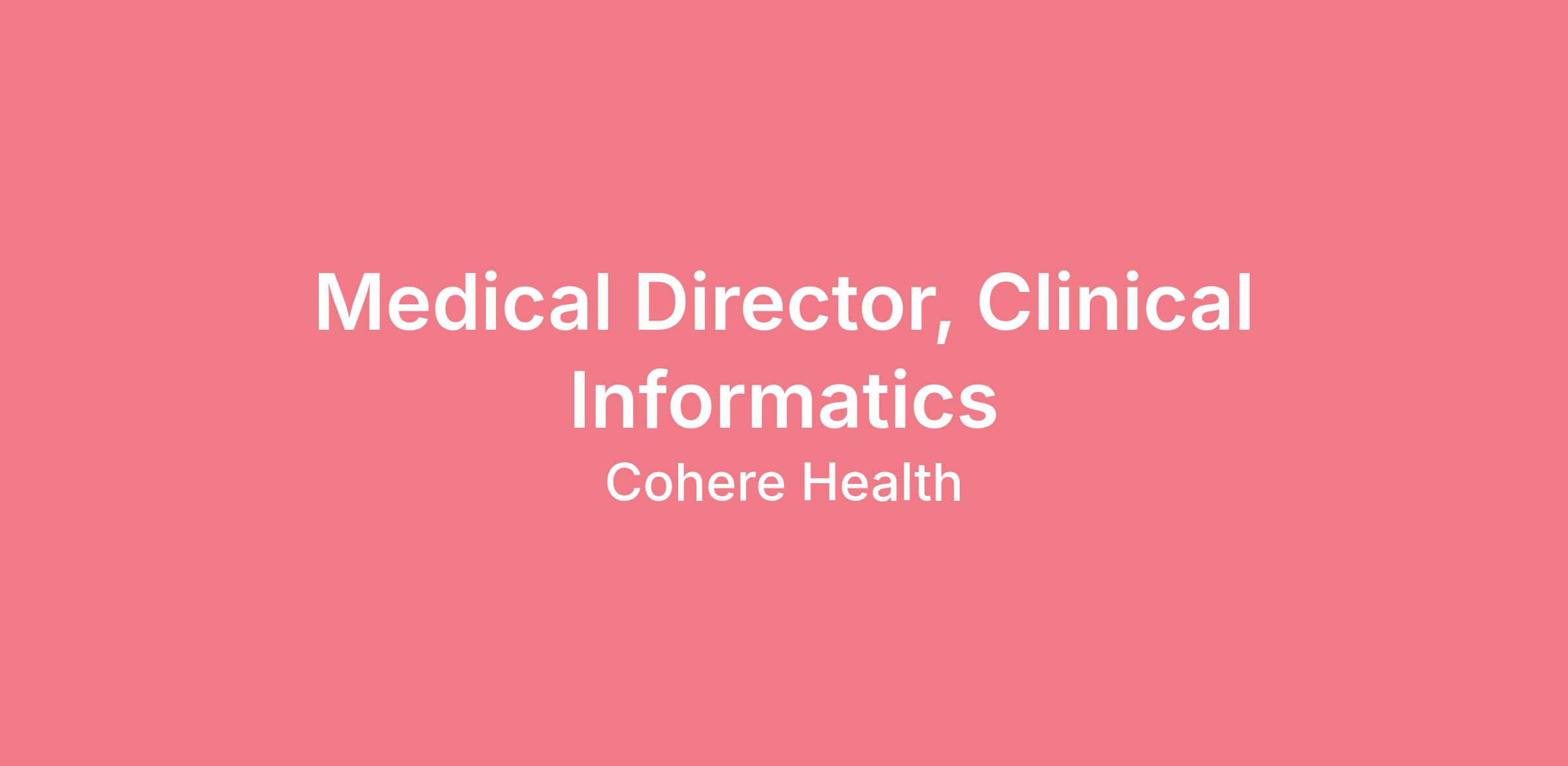 Cohere Health is seeking a Medical Director, Clinical Informatics to join our team of physician leaders, technologists, and data scientists transforming how healthcare decisions are made. This individual will play a critical role in shaping our clinical informatics strategy, working at the intersection of evidence, data science, and clinical policy to enhance the quality, accuracy, and interoperability of our solutions.