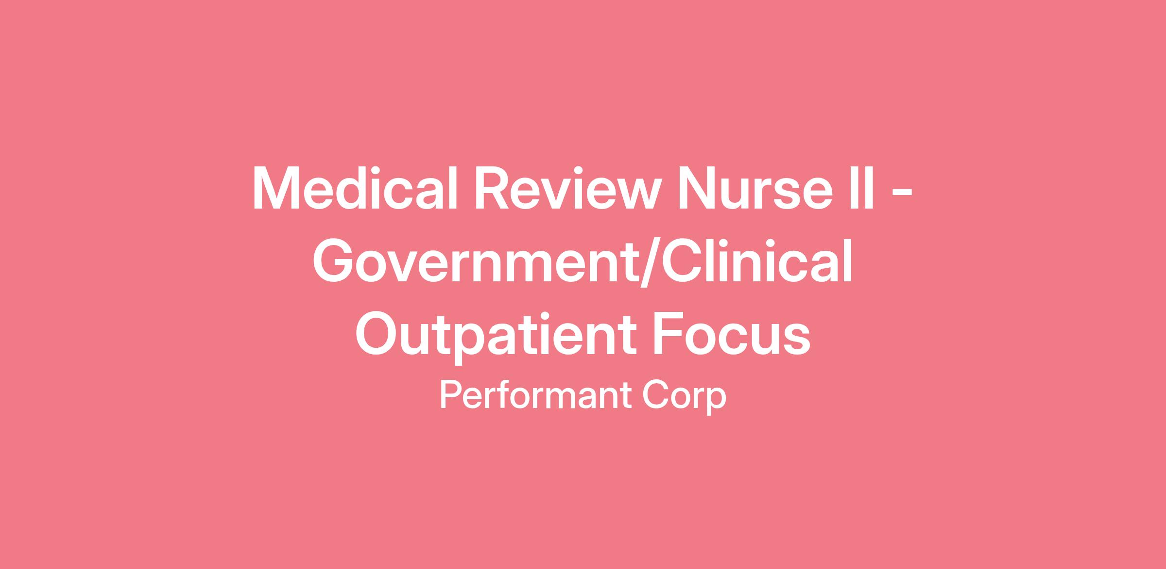 Hiring Range:$75,000 - $80,000The Medical Review Nurse II - Government/Clinical Outpatient Focus primarily performs medical claims audit reviews. As a MR Nurse, you will join a team of experienced medical auditors and coders performing retrospective and prepayment audits on claims for Government and Commercial Payers. You will work remotely in a fast paced and dynamic environment and be part of a multi-location team.