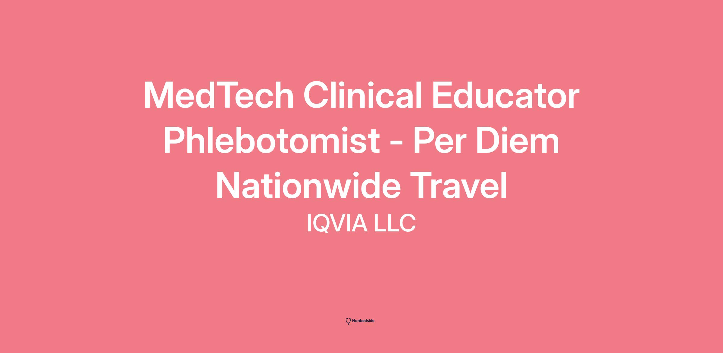 MedTech Clinical Educator Phlebotomist - Per Diem Nationwide Travel page is loaded## MedTech Clinical Educator Phlebotomist - Per Diem Nationwide Travellocations: Chicago, ILtime type: Part timeposted on: Posted Todayjob requisition id: R1511776**Job Description**Our Phlebotomist Clinical Educators experience a unique opportunity to employ their clinical nursing expertise in a new way outside patient care, while continuing to collaborate with healthcare professionals and advocate for the well-being of patients through medical device technology. You will be responsible for training and educating healthcare professionals, registered nurses and physicians on new medical devices featuring automated retraction technology.* Your primary focus will be in-servicing and education only, no sales responsibilities, and no bedside care.* A desire to expand your talents in clinical education.* Per-diem position requiring travel and flexibility to work with your current schedule.* Average 1-2 assignments per month, ranging 3-5 days per assignment. Travel regionally and nationally to support customer needs.IQVIA takes the approach to helping customers drive healthcare forward in this challenging, fast-paced environment. We help customers accelerate results, improve patient outcomes, and unleash new opportunities.**Responsibilities:*** Provide peer-to-peer education and in-servicing to healthcare professionals, nurses, physicians, and hospital staff to support medical device implementations.* Assess customer-specific education needs and collaborate with staff to deliver a positive educational experience.* Utilize expertise to answer questions and address concerns with the medical device.* Provide updates, reports, and valuable feedback to client during and after in-service assignments.**Job Requirements:*** Phlebotomist certification preferred, experience may be considered in leu of certification.* Minimum 5+ years’ experience as a phlebotomist preferred.* Prior experience with RTI products strongly preferred.* Prior experience with immunization clinic preferred.* Leadership experience (manager, educator, preceptor) can be helpful but is not required.* Ability to travel locally, regionally, and nationally. You will have a flexible schedule, an opportunity to travel, grow and expand into new opportunities while earning supplemental income and learning the medical device industry.Duties may require compliance with client requirements that all those performing services on-site be fully vaccinated.The actual pay will vary based on factors like candidate qualifications and competencies. Certain roles are eligible for annual bonus, sales incentives and/or stock. Benefits may include healthcare, retirement, paid time off, and more.IQVIA is a leading global provider of clinical research services, commercial insights and healthcare intelligence to the life sciences and healthcare industries. We create intelligent connections to accelerate the development and commercialization of innovative medical treatments to help improve patient outcomes and population health worldwide. Learn more atIQVIA is proud to be an equal opportunity employer. All qualified applicants will receive consideration for employment without regard to race, color, religion, sex, sexual orientation, gender identity, national origin, disability, status as a protected veteran, or any other status protected by applicable law.The potential base pay range for this role is $30-$34 per hour. The actual base pay offered may vary based on a number of factors including job-related qualifications such as knowledge, skills, education, and experience; location; and/or schedule (full or part-time). Dependent on the position offered, incentive plans, bonuses, and/or other forms of compensation may be offered, in addition to a range of health and welfare and/or other benefits.IQVIA is a leading global provider of clinical research services, commercial insights and healthcare intelligence to the life sciences and healthcare industries. We create connections that accelerate the development and commercialization of innovative medical treatments. Everything we do is part of a journey to improve patient outcomes and population health worldwide.To get there, we seek out diverse talent with curious minds and a relentless commitment to innovation and impact. No matter your role, everyone at IQVIA contributes to our shared goal of helping customers improve the lives of patients everywhere. Thank you for your interest in growing your career with us.