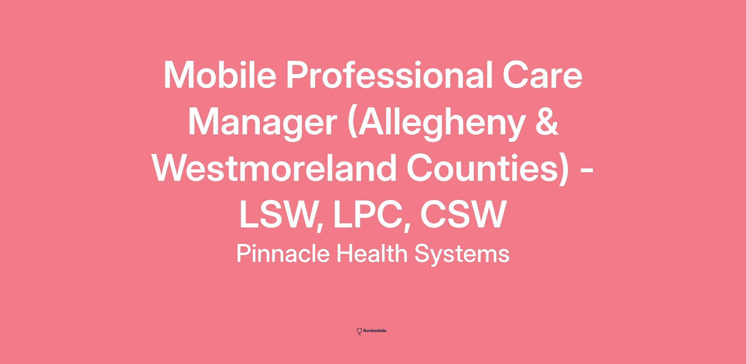 UPMC Health Plan is hiring a full-time Mobile Professional Care Manager position to support the Population Health Case Management department. This is a Monday through Friday daylight role (8:00 a.m. - 4:30 p.m.). This is a community-based position and will require travel throughout Allegheny and Westmoreland counties. Occasional travel may be required throughout surrounding counties. The Care Manager will support UPMC Health Plan members local to these areas. The incumbent will be expected to undergo training and attend meetings in Pittsburgh, as needed.