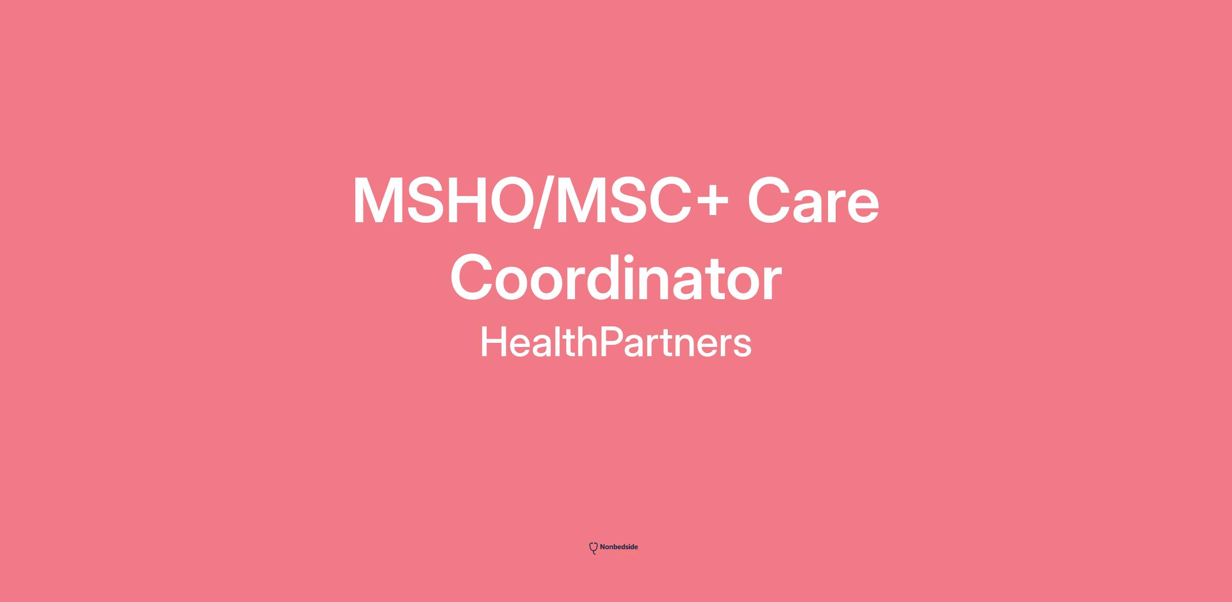 HealthPartners is hiring an MSHO/MSC+ Care Coordinator. This position exists to provide support to patients, their families, and physicians in addressing medical and social concerns; educate and empower patients and families to make informed personal health care decisions; and facilitate communication between patient, physician, health plan and community.