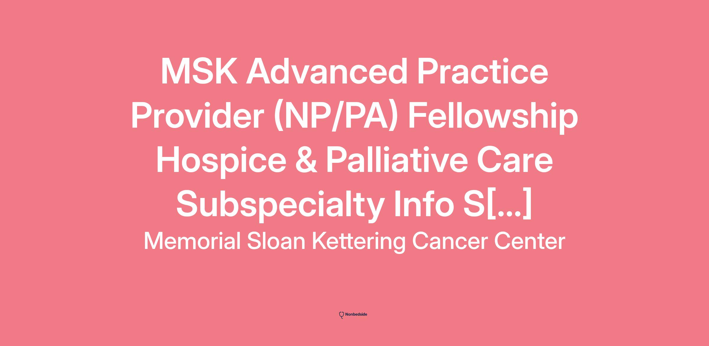 This Hospice and Palliative Care program is one of the ten subspecialty tracks offered within the MSK APP Oncology Fellowship. This 15‑month program, starting on June 29, 2026, is designed to provide qualified, committed, and compassionate APPs with the clinical and academic expertise needed to become future leaders in palliative and supportive care. Nurse practitioners (NPs) and physician assistants (PAs) in the program work alongside members of the Supportive Care Service and train side‑by‑side with physician fellows. The interprofessional approach, where NPs, PAs, and physicians train together at this world‑renowned cancer center, ensures that graduates are uniquely prepared for collaborative care and team science. Upon completion of the fellowship at Memorial Sloan Kettering Cancer Center, NPs and PAs are prepared for independent practice and continued professional advancement in the palliative care subspecialty.