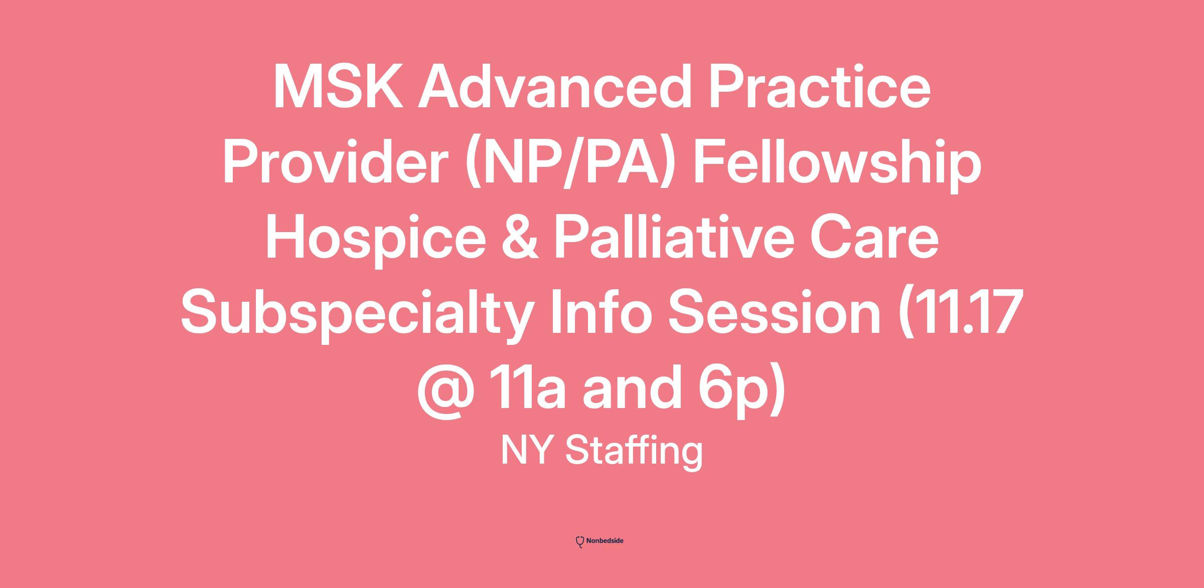 This Hospice and Palliative Care program is one of the ten subspecialty tracks offered within the MSK APP Oncology Fellowship. This 15-month program, starting on June 29, 2026, is designed to provide qualified, committed, and compassionate APPs with the clinical and academic expertise needed to become future leaders in palliative and supportive care. Nurse practitioners (NPs) and physician assistants (PAs) in the program work alongside members of the Supportive Care Service and train side-by-side with physician fellows. The interprofessional approach, where NPs, PAs, and physicians train together at this world-renowned cancer center, ensures that graduates are uniquely prepared for collaborative care and team science. Upon completion of the fellowship at Memorial Sloan Kettering Cancer Center, NPs and PAs are prepared for independent practice and continued professional advancement in the palliative care subspecialty. The program is open to newly graduated APPs, as well as those with prior experience as an APP. The fellowship is especially well-suited for those looking to gain specialty exposure to oncology and those eager for an immersive learning experience.