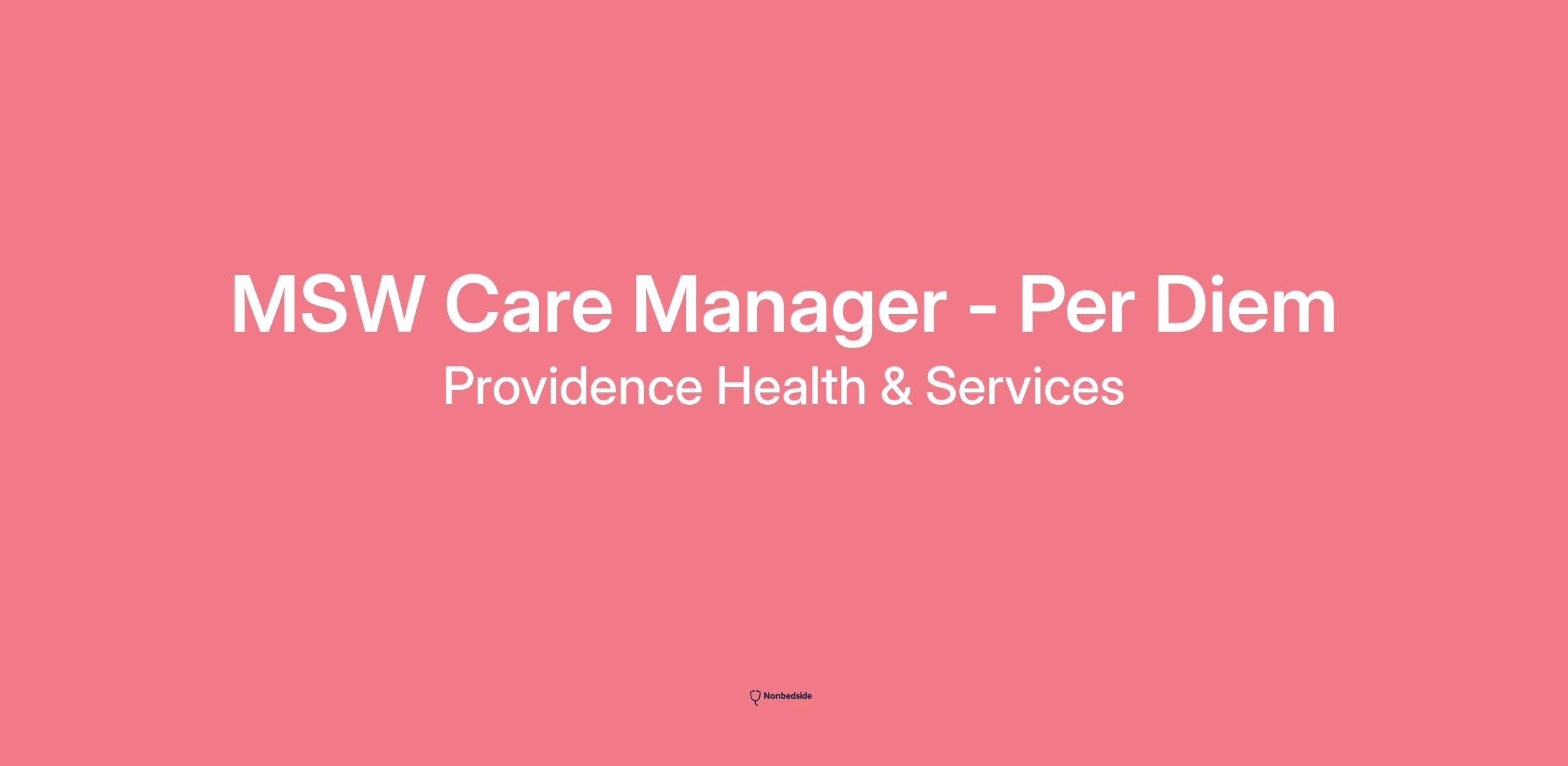 Care Manager MSW Providence Mission Hospital in Mission Viejo, CA. Positions available are Per Diem and will work 8-hour Day shifts.