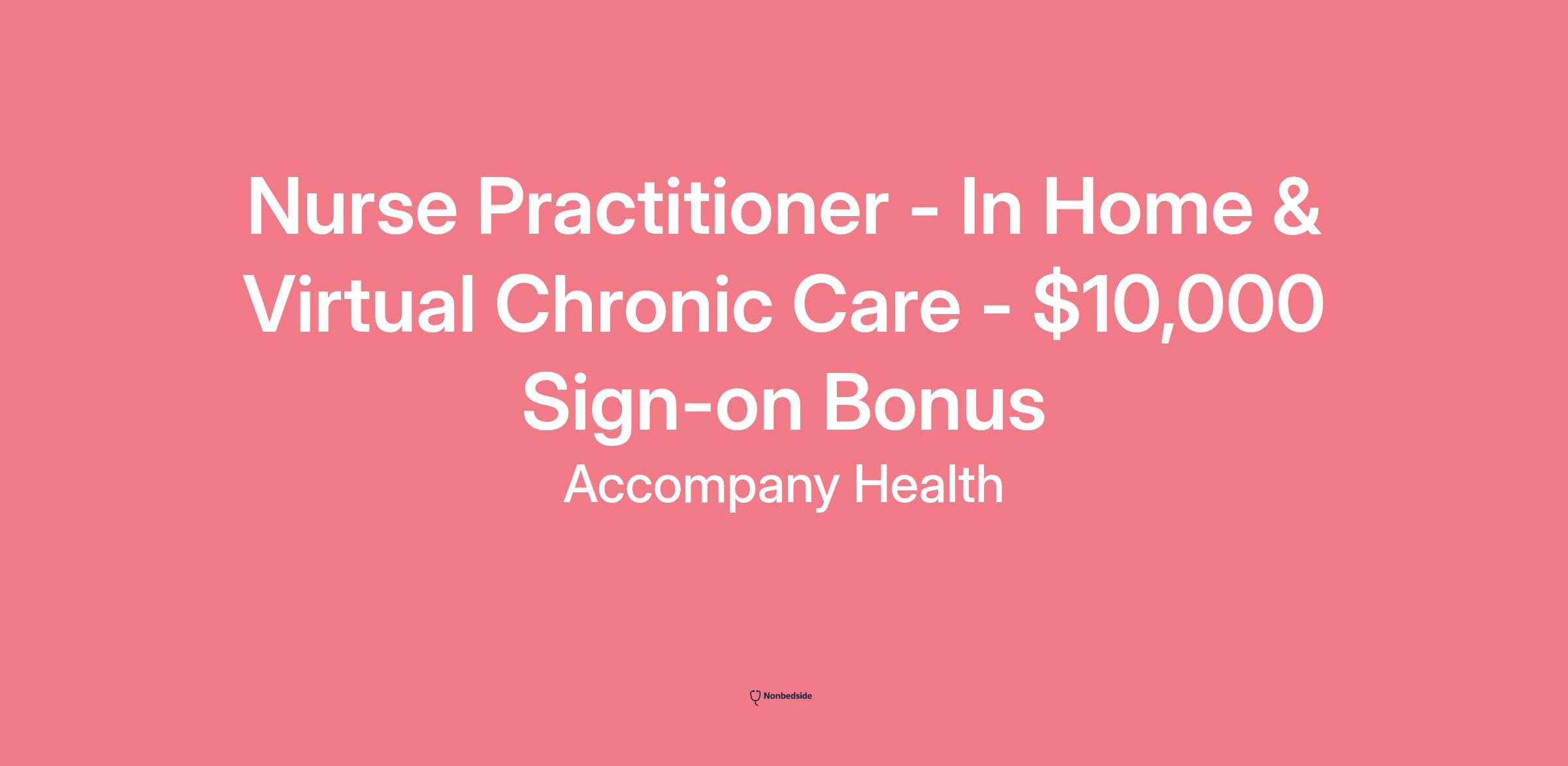 Overview Nurse Practitioner - In Home & Virtual Chronic Care with a $10,000 sign-on bonus. Base pay range: $120,000.00/yr - $145,000.00/yr. This role supports Accompany Health’s mission to deliver dignified, high-quality care to low-income patients with complex needs, through at-home and virtual care and 24/7 support.