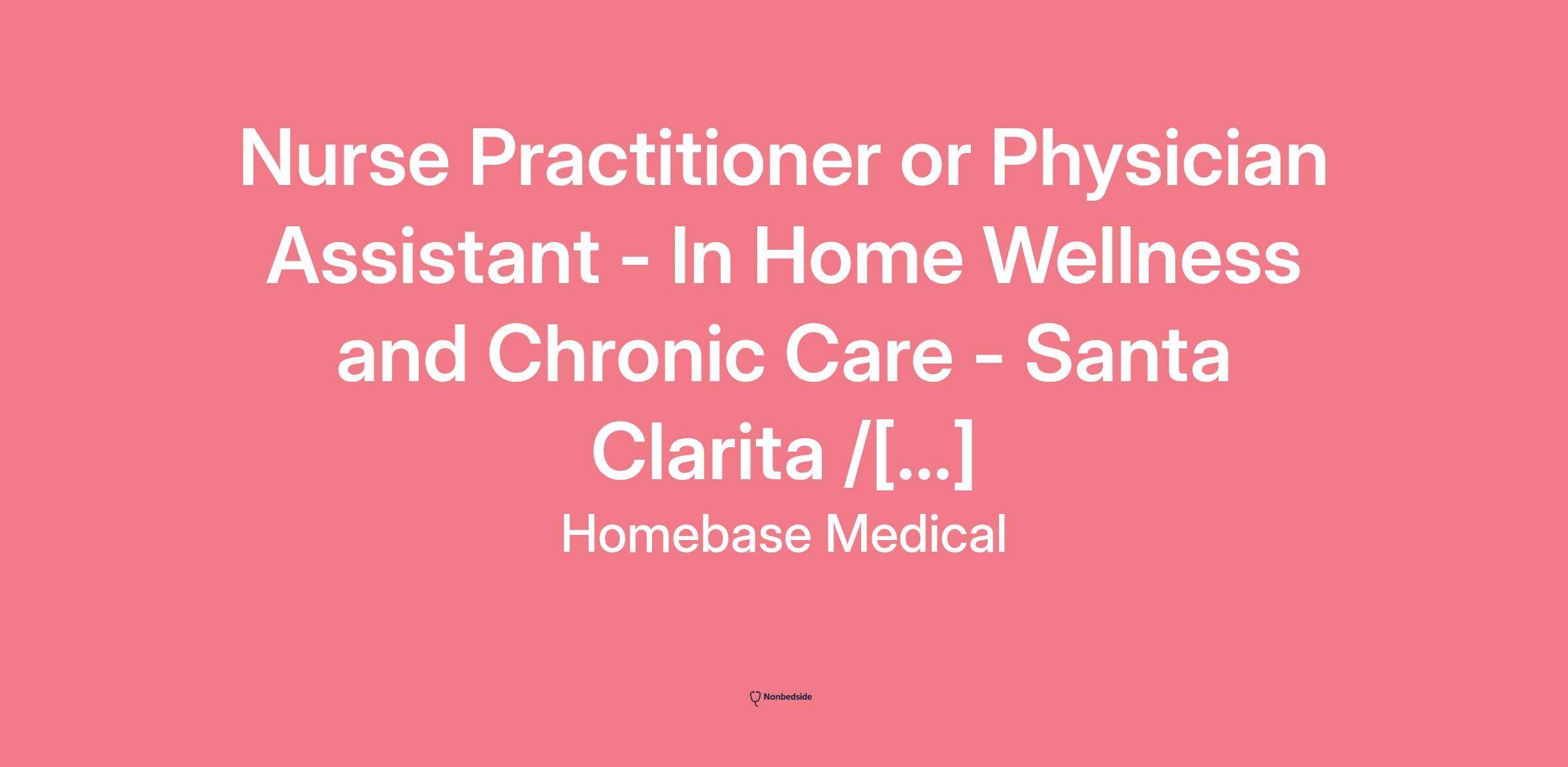 Homebase Medical is expanding rapidly into the Santa Clarita / Thousand Oaks, CA areas . We are currently searching for an experienced full-time Advanced Practice Clinician (Physician Assistant or Nurse Practitioner) to join our expanding house call practice. You will be responsible for primary care in the home setting, Board and Care, and Assisted Living Facilities.