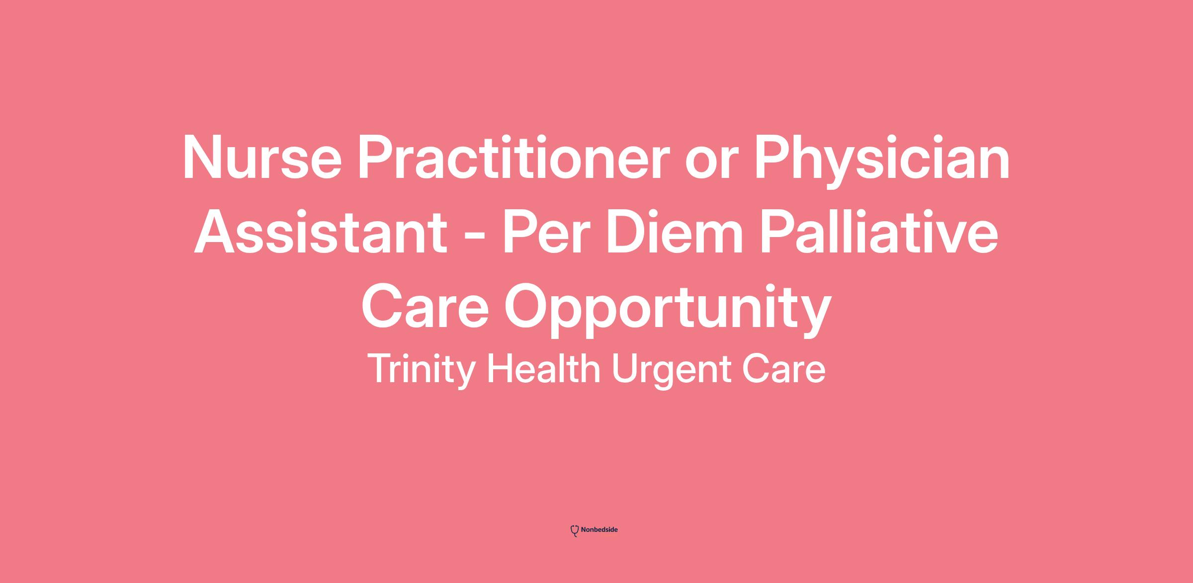 *Trusted by job-seeking physicians for 35 years!*3. Opportunity Details - Nurse Practitioner or Physician Assistant - Per Diem Palliative Care Opportunity# Nurse Practitioner or Physician Assistant - Per Diem Palliative Care OpportunityProfessionNurse Practitioner, Physician AssistantSpecialtyHospice & Palliative CareLoan RepaymentNot SpecifiedSalary RangeNot SpecifiedEmployment TypePer DiemBonuses OfferedNoneNot-for-profit501(c)(3)## OPPORTUNITY HIGHLIGHTS## ABOUT THE FACILITY**Trinity Health Medical Group (THMG)** is a multi-specialty network of more than 700 primary care and specialist physicians and growing. Our goal is to improve community health by providing easily accessible, high quality health care. In fact, quality improvement and excellence in care are at the core of our philosophy. Our many office locations throughout the greater Grand Rapids area offer convenience and easy access to care. In addition, THMG has several weekend urgent care or express care centers.For more information, please visit our website.## COMMUNITY DESCRIPTION**Grand Rapids, Michigan,** known for its unique combination of urban sophistication and small-town warmth, is located in Western Michigan on the banks of the legendary Grand River. Incorporated in 1839, today the community is rated among the top cities in the U.S., combining family-friendliness with safety, cleanliness, and an uncommon commitment to enterprise. Businesses tend to thrive because of the regions famous work ethic and a historical commitment to the value of innovation.Located just minutes away from the splendor of Lake Michigan beaches and dozens of quaint lakeshore towns and villages, Grand Rapids has developed a regional reputation for major artistic and cultural events, a full calendar of stage plays and concerts, outstanding museums, and a world-class botanical garden and sculpture park.Greater Grand Rapids is Michigans fastest growing region. A growing economy, outstanding health care, low cost of living, award-winning schools and diverse cultural options are just a few reasons why Grand Rapids is a great place to live. The region is home to people of nearly every race, creed, color, religion, and national origin the public-school students alone represent more than 40 languages and 53 countries.Conveniently located between Detroit and Chicago near Michigan's western shoreline, Grand Rapids is a center for manufacturing excellence, life science discovery, and technological innovation. The region is now the center of one of the largest investments in life sciences in the country. More than $1 billion has been invested in research and patient care propelling Greater Grand Rapids onto the elite list of Americas top sustainable, knowledge-based economies.For more information on Grand Rapids, MI please visit## About Trinity HealthTrinity Health is one of the largest not-for-profit, faith-based health care systems in the nation. It is a family of 127,000 colleagues and more than 38,300 physicians and clinicians caring for diverse communities across 26 states. Nationally recognized for care and experience, the Trinity Health system includes 93 hospitals, 107 continuing care locations, the second largest PACE program in the country, 142 urgent care locations and many other health and well-being services. In fiscal year 2024, the Livonia, Michigan-based health system invested $1.3 billion in its communities in the form of charity care and other community benefit programs.**Our mission:** *We, Trinity Health, serve together in the spirit of the Gospel as a compassionate and transforming healing presence within our communities.* We support this mission by living our core values of *Reverence, Commitment to Those Who are Poor, Justice, Stewardship, and Integrity.* Committed to recruiting talented physicians, we are looking for physicians who share our values and want to help us fulfill the health care needs of the communities we serve.At Trinity Health, we value the physician relationship and focus on partnering with our physicians. Whether you are a practicing physician looking to relocate or a medical resident, we offer opportunities with the flexibility to fit your individual needs. Contact our Physician Recruitment team at docopps@trinity-health.org to learn more.As a physician-led organization, **Trinity Health Medical Group (THMG)** offers the best of both worlds: the autonomy and close-knit culture of a private practice, backed by the strength and resources of a leading national healthcare system.**Elevate Your Career!****Opportunity Details*** **Comprehensive Care:** Deliver high-quality care in a collaborative, patient-centered environment.* **Work-Life Balance:** Enjoy flexible scheduling and advanced digital tools like Epic and MyChart.* **Supportive Team Culture:** Work alongside skilled physicians, APPs, and dedicated support staff.* **Career Growth:** We prioritize internal advancement and professional development.* **Competitive Compensation & Benefits You May Be Eligible For:**+ Competitive salary + incentives+ 403(b) retirement plan+ Malpractice insurance with tail coverage**Requirements*** Relevant clinical experience in palliative care, geriatric medicine, or critical care populations preferred* **APPs:** Board certified in specialty prior to employment* Active Michigan medical license (or ability to obtain)* DEA license* BLS certification (must be maintained)**Duties & Responsibilities**A typical day may include:* Providing direct patient care* Collaborating with multidisciplinary teams* Participating in teaching and mentoring* Documenting in Epic EMR* Engaging in quality improvement initiatives* Supporting community health efforts**Diversity & Inclusion**We are proud to be an equal opportunity employer. Trinity Health Medical Group celebrates diversity and is committed to creating an inclusive environment for all employees and applicants.Were seeking a passionate and driven Per Diem Physician Assistant or Nurse Practition