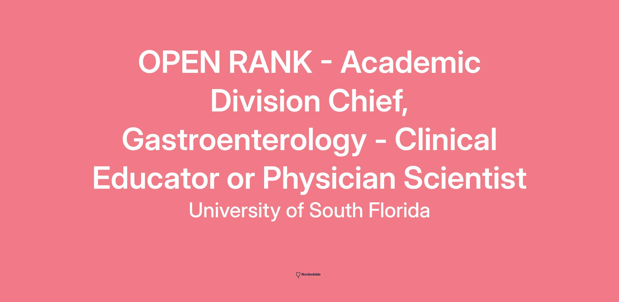 The Morsani College of Medicine (MCOM) of the University of South Florida (USF) is conducting a national search for a distinguished academic clinical leader in gastroenterology to serve as the Division Chief & Director, Digestive Diseases & Nutrition within the Department of Internal Medicine. The Division of Digestive Diseases and Nutrition encompasses all subspecialities of gastroenterology. Our passionate faculty have been recognized in USN&WR rankings for 9 consecutive years and in 2023 were ranked #15 in the nation for state-of-the-art patient care.