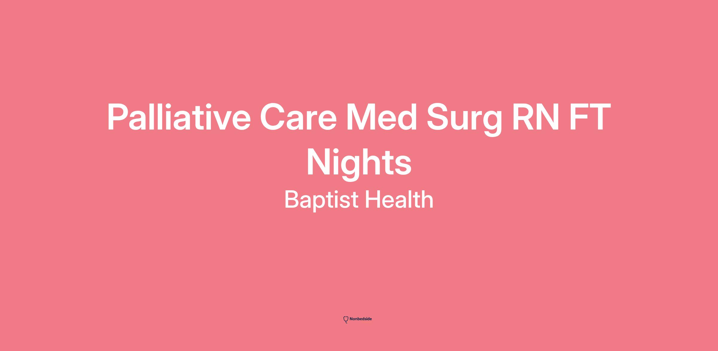 Palliative Care Med Surg RN FT Nights page is loaded## Palliative Care Med Surg RN FT Nightslocations: Louisville, KYtime type: Full timeposted on: Posted Todayjob requisition id: R25093388**Summary****Job Description:****Job Summary:**Registered nurse implements the nursing process for each assigned to his/her care regardless of age (i.e. infancy to geriatric) and is responsible for the patient’s care consistent with the Kentucky Nursing Laws and organizational policies and procedures. The registered nurse promotes positive patient outcomes, and the delivery of quality patient care and initiates change through active involvement in the unit-based and hospital shared governance councils while contributing to a healthy professional practice environment.National Professional Nursing Standards serve as guidelines for nurses as they utilize critical thinking and clinical reasoning skills and exercise appropriate nursing judgment. The registered nurse collaborates with the inter-professional team to enhance patient outcomes. The registered nurse serves as a role model through actively participating in the process of continuous professional development and lifelong learning. Utilizes the Nursing Process as the framework for providing care.**Minimum Education, Training and Experience Required:**Active Kentucky LicenseBSN preferredBLS within 90 days**Work Experience****Education**### *If you would like to be part of a growing family focused on supporting clinical excellence, teamwork and innovation, we urge you to apply now!*### Baptist Health is an *Equal Employment Opportunity* employer.[](blob:https://bhs.wd1.myworkdayjobs.com/169618b7-36a4-4c97-81de-52ff29b9c5c9)0:00 / 2:44