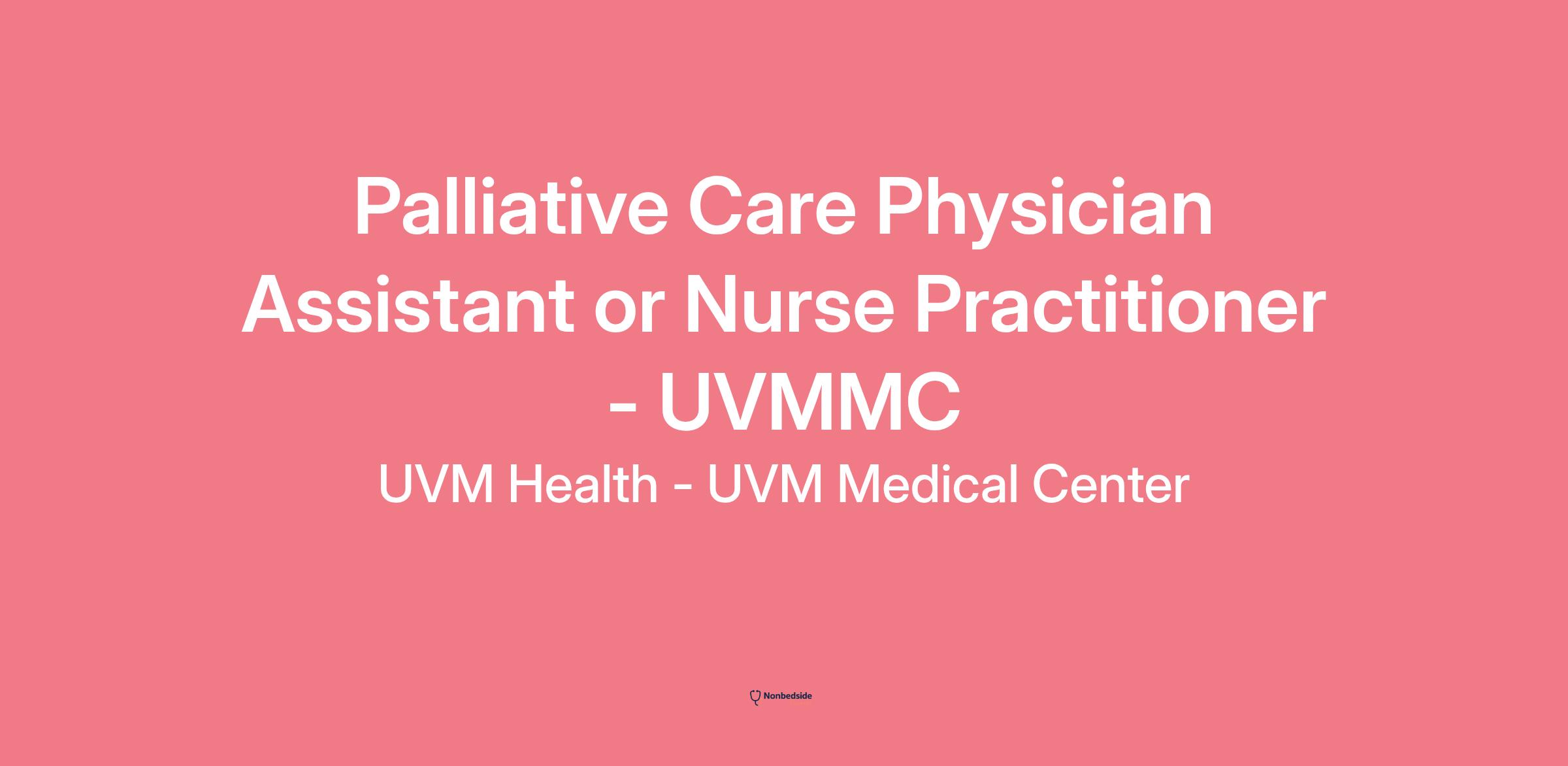 Palliative Care Physician Assistant or Nurse Practitioner - UVMMC Join to apply for the Palliative Care Physician Assistant or Nurse Practitioner - UVMMC role at UVM Health - UVM Medical Center .