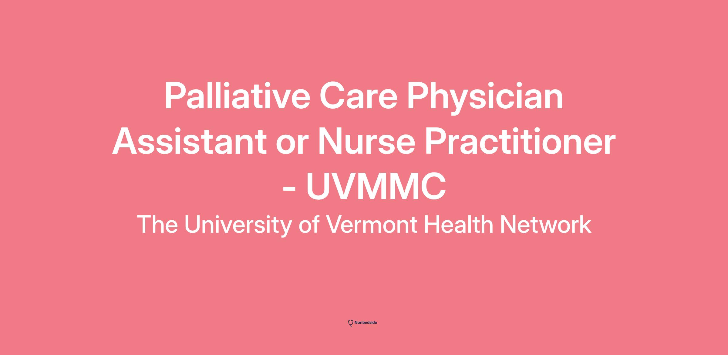 Summary The University of Vermont Medical Center is seeking an experienced and empathetic Physician Assistant (PA) or Nurse Practitioner (NP) to join our interdisciplinary inpatient Palliative Care team.