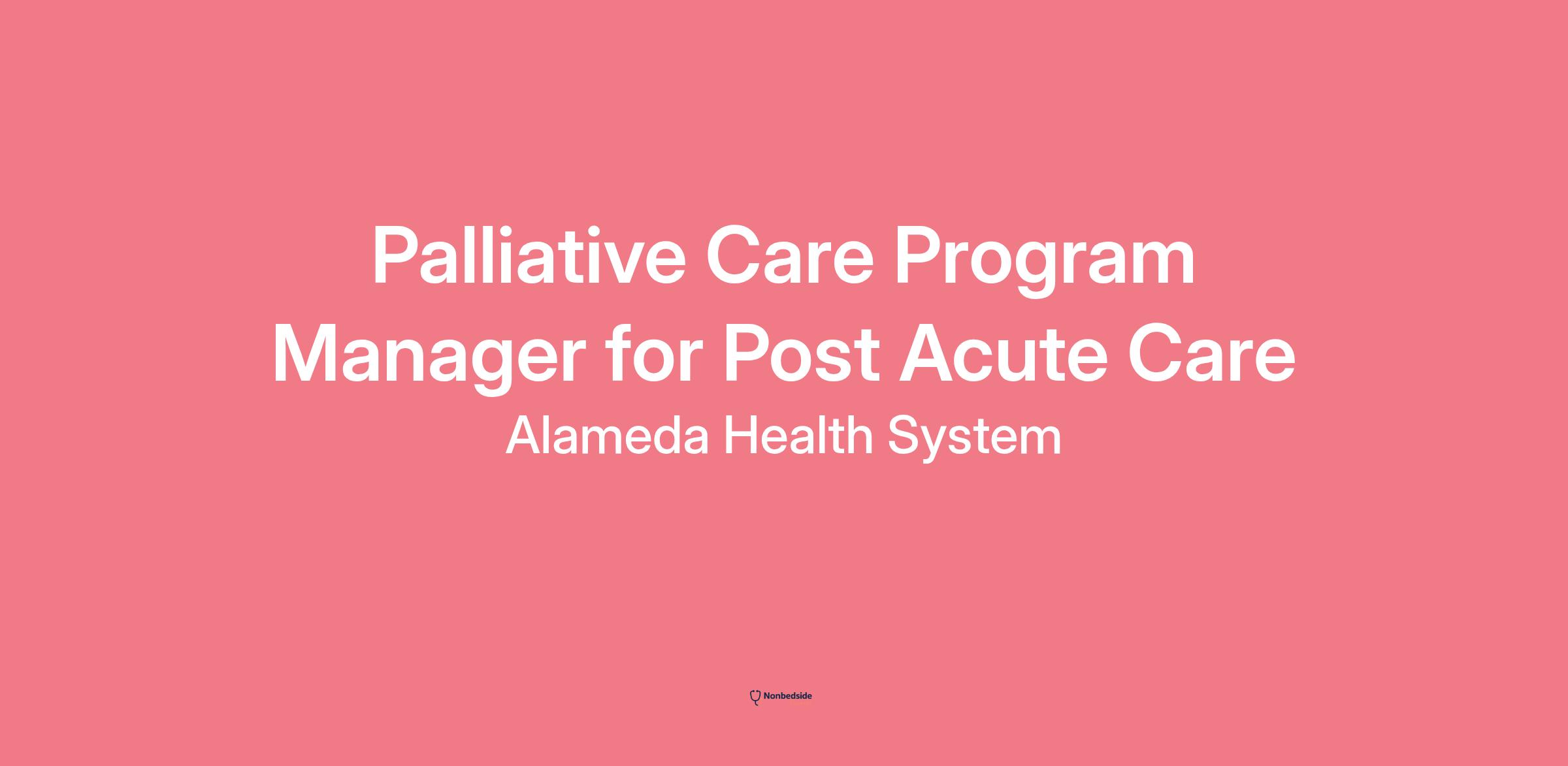 Palliative Care Program Manager for Post Acute Care Our dynamic and expanding Palliative Care Program within the Alameda Health System is hiring! We are looking for a passionate APP with experience in hospice/palliative care/geriatrics to help lead our efforts to expand subspecialty palliative care services to our post-acute facilities, which include three skilled nursing facilities, an acute rehab, and a subacute facility. In this role, you will lead clinical care efforts with a full interdisciplinary team, collaborate in designing and delivering training for facility staff, residents and families, and manage quality improvement efforts. You will become a key and valued leader within our palliative care program which provides comprehensive, interprofessional, high-quality serious illness care tailored to the needs of our linguistically, ethnically, and socioeconomically diverse population. Candidates with bi-lingual or multi-lingual capability, including Spanish, Cantonese, Mandarin, Vietnamese, Tagalog, and/or Russian are especially encouraged to apply.