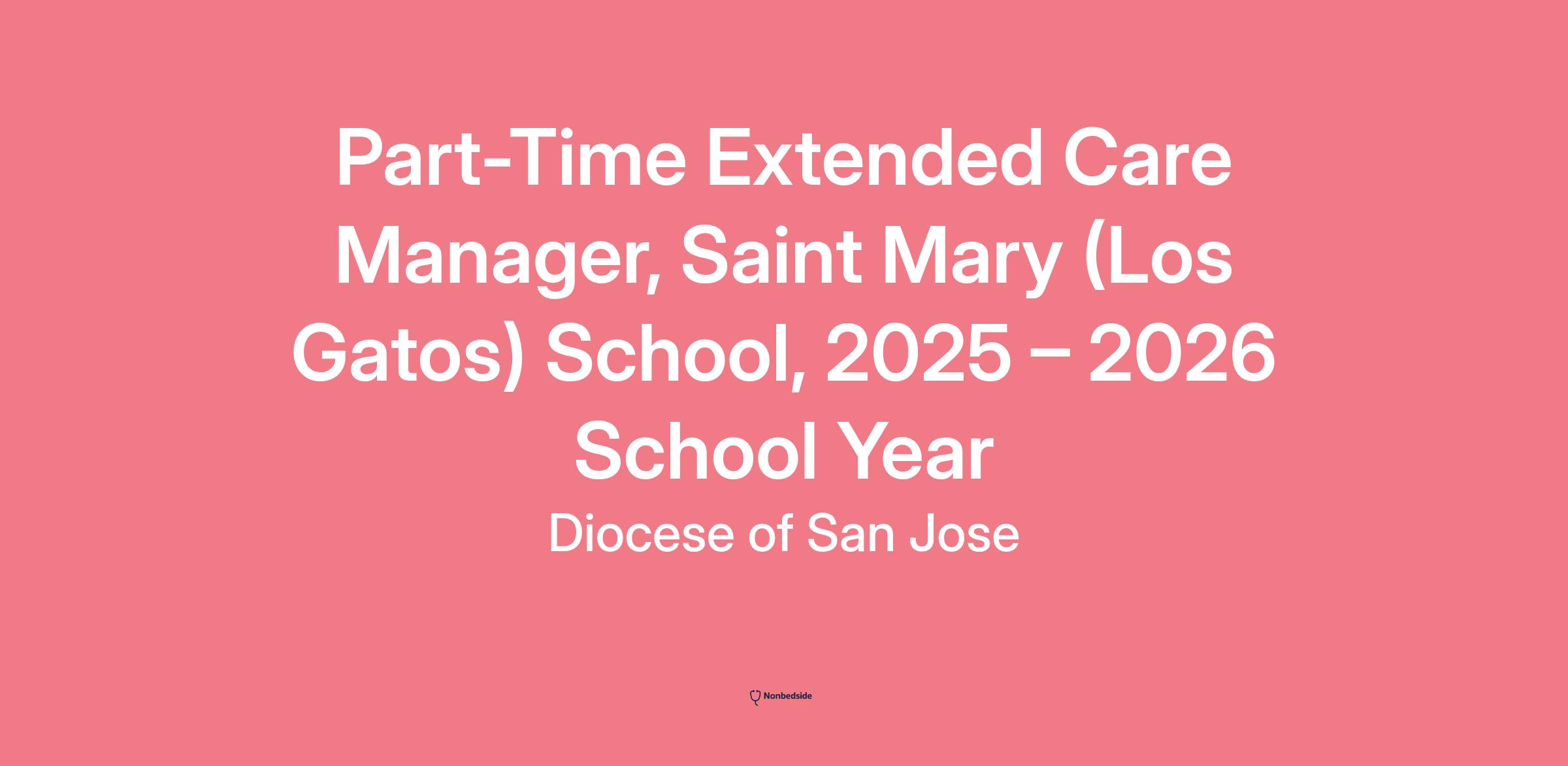 Overview St. Mary of the Immaculate Conception School, in Los Gatos, CA is seeking an Extended Care Manager for the 2025-2026 school year. We are looking for energetic, passionate and dedicated staff members who truly want to make a difference in the lives of students, uphold the mission of the school and be part of this rewarding ministry of Catholic education in the Diocese of San Jose.