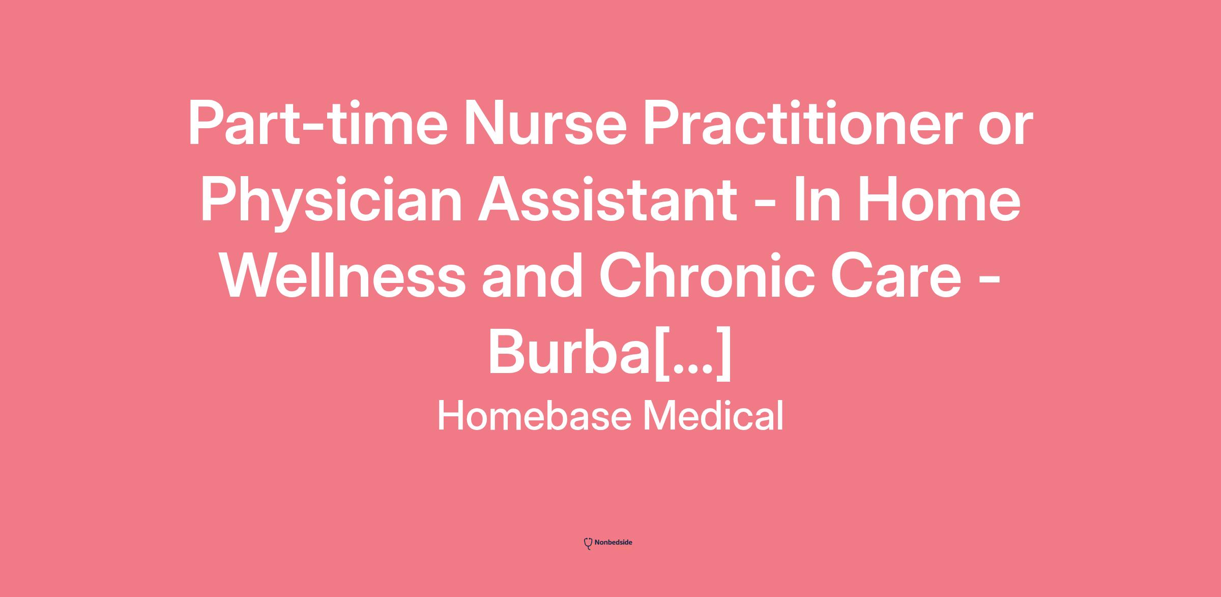 Homebase Medical is expanding rapidly into the Burbank, CA area. We are currently searching for experienced part-time Advanced Practice Clinicians (Physician Assistant or Nurse Practitioner) to join our expanding house call practice.
