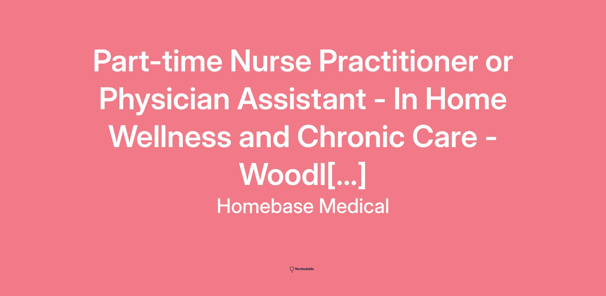 Homebase Medical is getting back to basics. Our mission is to optimize the quality of life for homebound older adults, allowing them to live independently and with dignity in their own homes. We make house calls - enabling access to quality wrap-around services for homebound older adults with complex health needs while improving the quality of their lives, right at home. We offer an array of medical and chronic care services and we're backed by SCAN, a not-for-profit organization that has a history of supporting and improving the health and independence of older adults for over 45 years. Homebase Medical is expanding rapidly into the Woodland Hills / San Fernando Valley, CA area. We are currently searching for experienced part-time Advanced Practice Clinicians (Physician Assistant or Nurse Practitioner) to join our expanding house call practice.