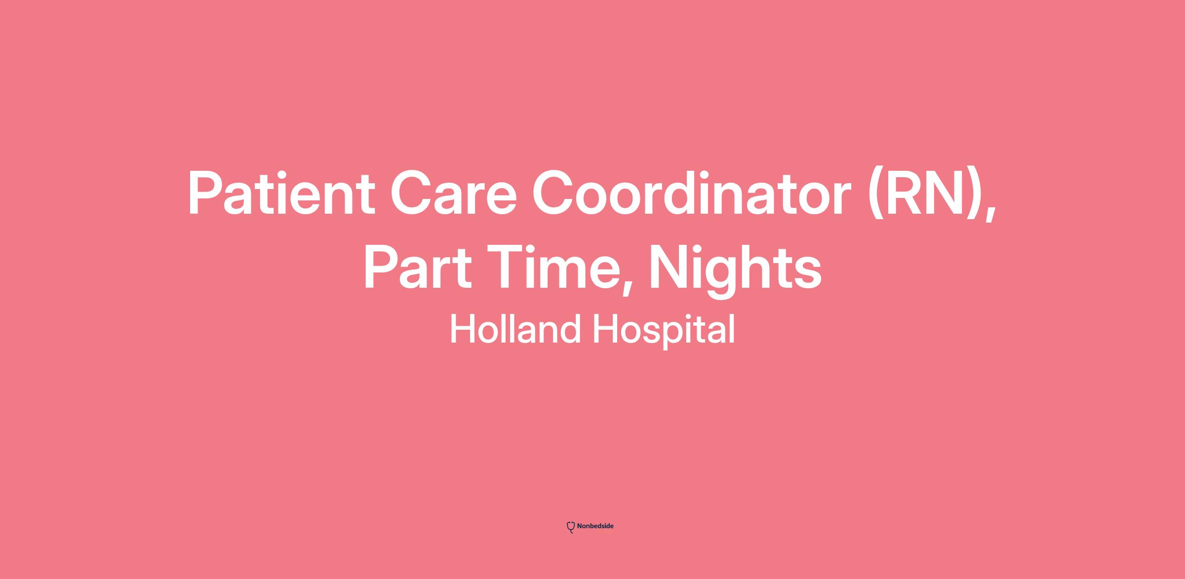 Part-time, Nights, 7p-7a The Patient Care Coordinator (PCC) acts as the representative of hospital administration and management, focuses on coordinating, facilitating, and prioritizing the efforts of personnel and departments to promote effective and efficient quality patient outcomes. This position must be able to demonstrate the knowledge and skills necessary to provide care and service appropriate to the age of the patients served in his/her area.