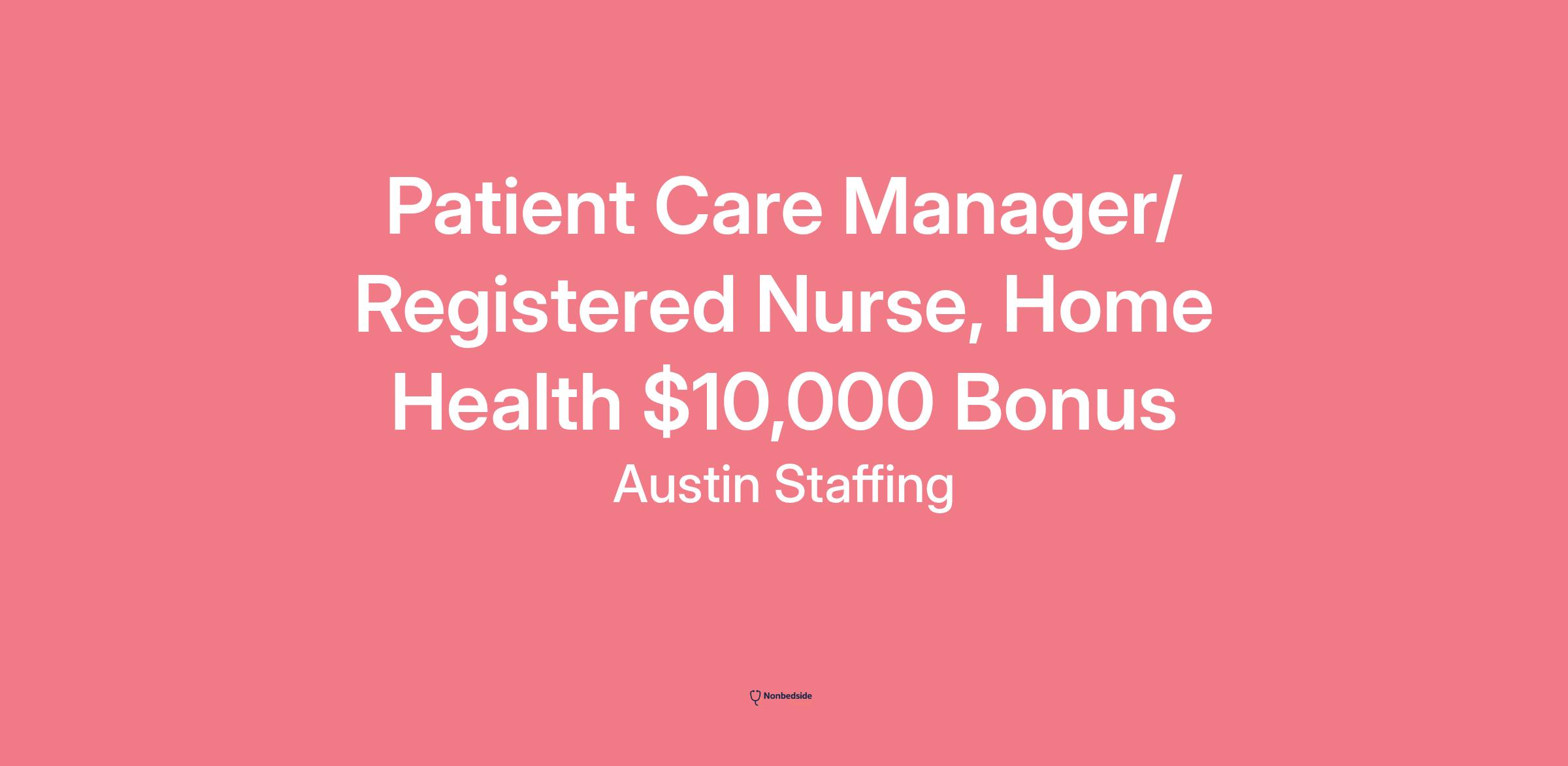 Reimagine Your Career in Home Health Caring for others is more than what you do it's who you are. At AccentCare, you'll join a purpose-driven, collaborative culture that sets the standard for excellence and gives you the trust and tools to do your best work. You'll belong to a team that cares deeply for patients and each other; a team committed to consistently providing exceptional care. We're proud to be named one of America's Greatest Workplaces 2025 by Newsweek a reflection of our shared commitment to excellence, integrity and compassion as we shape the future of aging in place. When you thrive, so does the community of care we're building together. Be the Best Patient Care Manager You Can Be If you meet these qualifications, we want to meet you!