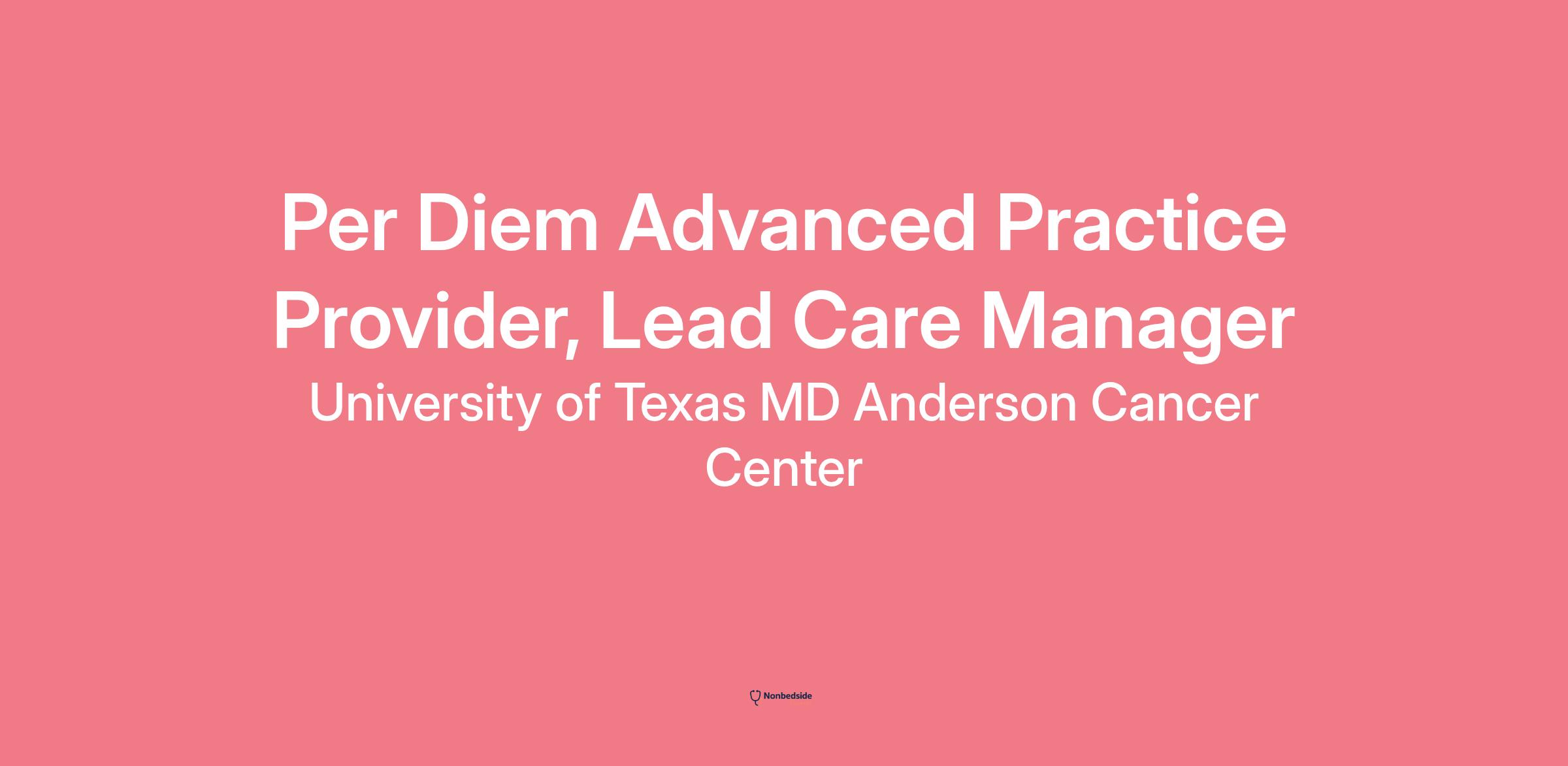 The primary purpose of the Clinical Programs of askMDAnderson is to provide transitions in care and after-hour triage via phone and online communication for patients, family, and caregivers (hereto for clients) after they have visited the MD Anderson Cancer Center. These programs support our patients' need for access to care evenings and weekends and serves as the front-line healthcare resource for anyone who needs clinical support. This position requires a wide depth and knowledge pertaining to cancer care and demonstrates consistently strong communication skills, motivational interviewing, and knowledge of cancer as well as relevant MD Anderson services and resources. Shifts vary as Per Diem APP, covering primarily weekends (Saturday & Sunday) including evenings, nights and holidays any day of the week where staffing need is high. The APP will maintain their clinical practice necessary to maintain licensure, certification, and clinical knowledge competency to provide safe and high-quality patient care.